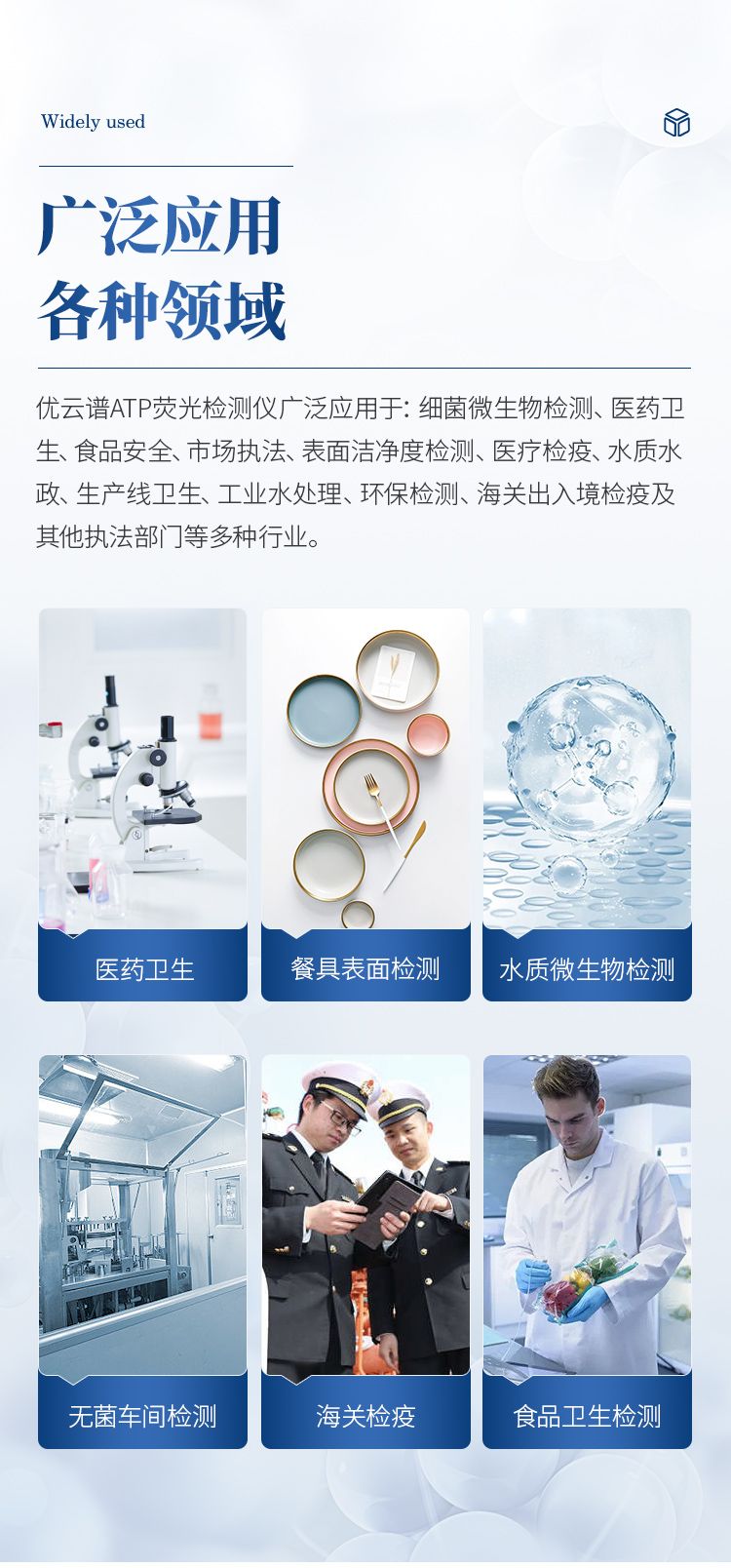 優(yōu)云譜ATP熒光檢測(cè)儀用途廣泛,可用于: 食品、醫(yī)藥衛(wèi)生、醫(yī)藥、日化、造紙、工業(yè)水處理、國(guó)防以及環(huán)保、水政、海關(guān)出入境檢疫及其他執(zhí)法部門等多種行業(yè) 。