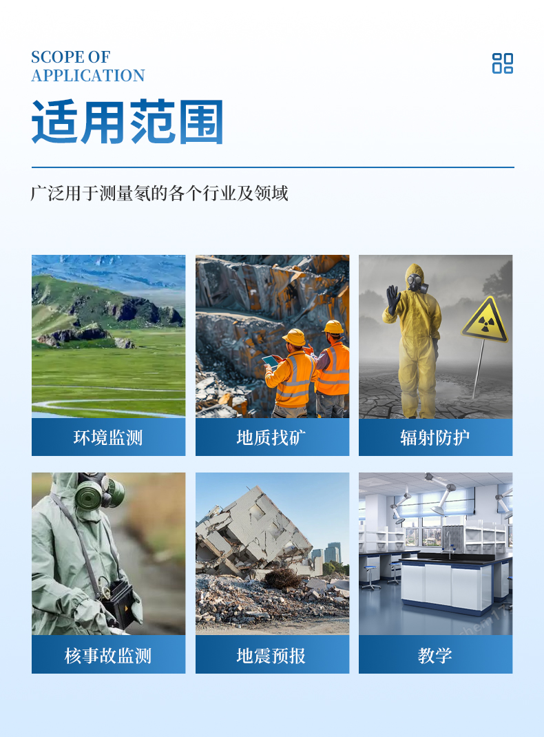 環(huán)境空氣、土壤、水等氡體積活度及土壤、建材等表面氡析出率的測(cè)量??捎糜诃h(huán)境監(jiān)測(cè)、地質(zhì)找礦、輻射防護(hù)、核事故監(jiān)測(cè)、輻射劑量評(píng)價(jià)、地震預(yù)報(bào)及教學(xué)等。