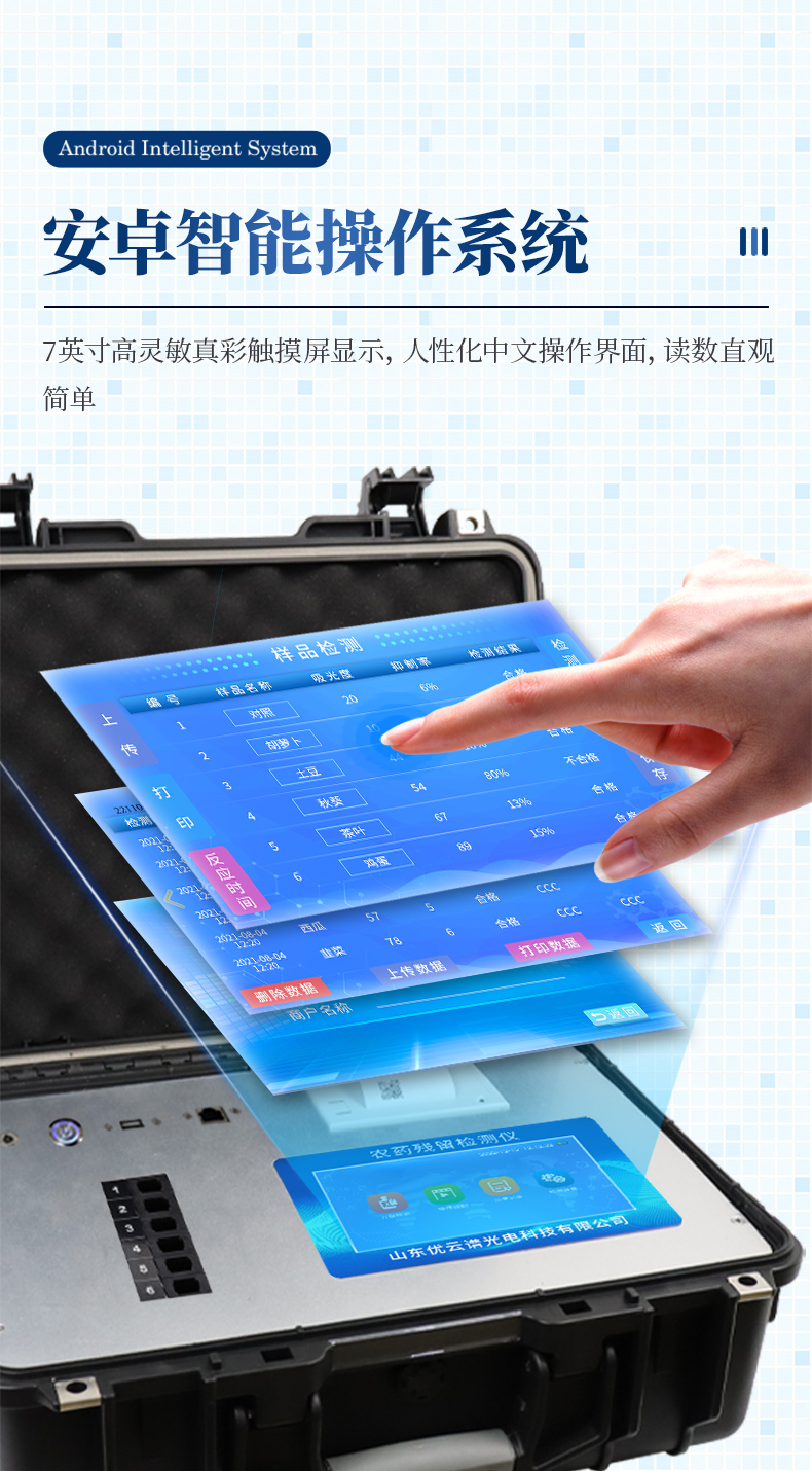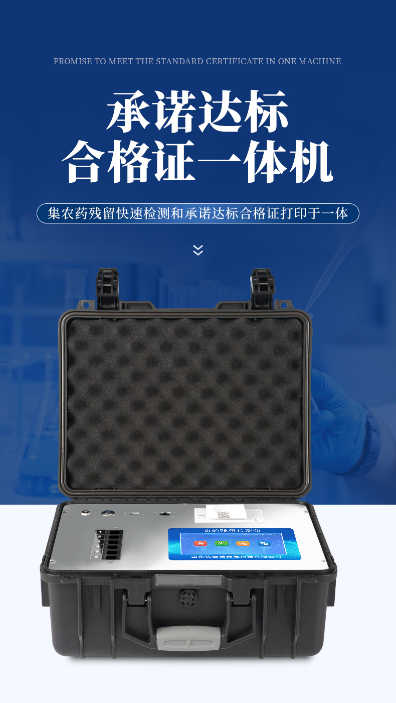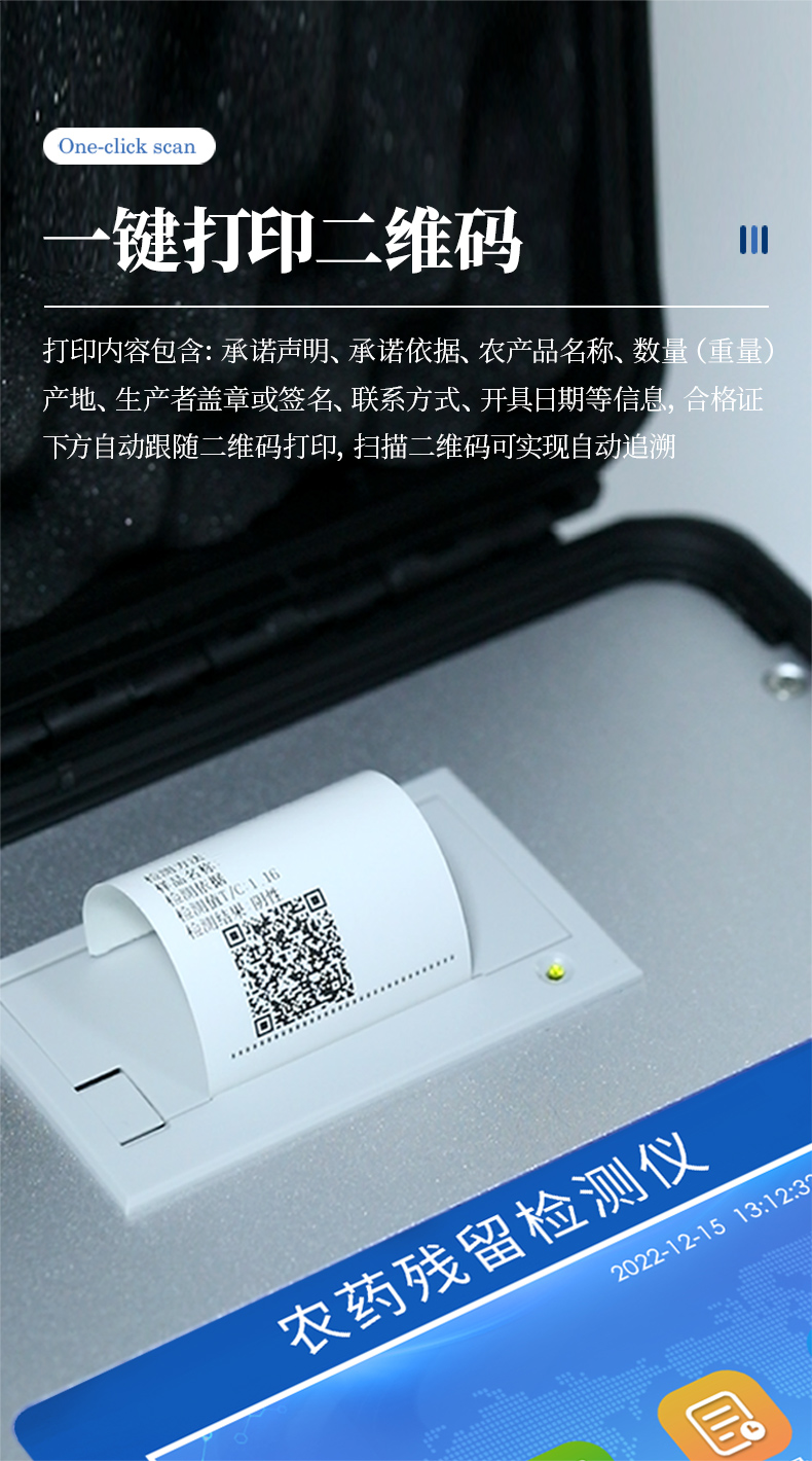 山東優(yōu)云譜光電科技有限公司是一家專業(yè)生產(chǎn)食品快檢儀器的高新技術(shù)領域企業(yè)。我公司根據(jù)農(nóng)村農(nóng)業(yè)部辦公廳關(guān)于《加快推進承諾達標合格證制度試行工作的通知》,在原有的食用農(nóng)產(chǎn)品合格證檢測打印一體機的基礎上優(yōu)化了打印標簽,使打印標頭和打印內(nèi)容符合承諾達標合格證的最新要求。該儀器集農(nóng)藥殘留快速檢測和承諾達標合格證打印于一體,智能化程度高,在快速檢測的同時實現(xiàn)承諾達標合格證的打印。打印內(nèi)容包含:承諾聲明、承諾依據(jù)、農(nóng)產(chǎn)品名稱、數(shù)量(重量)、產(chǎn)地、生產(chǎn)者蓋章或簽名、聯(lián)系方式、開具日期等信息,合格證下方自動跟隨二維碼打印,掃描二維碼可實現(xiàn)自動追溯。實現(xiàn)農(nóng)產(chǎn)品安全的全程數(shù)據(jù)溯源,適合各地檢測機構(gòu)、農(nóng)業(yè)合作社、蔬菜批發(fā)市場等單位使用。