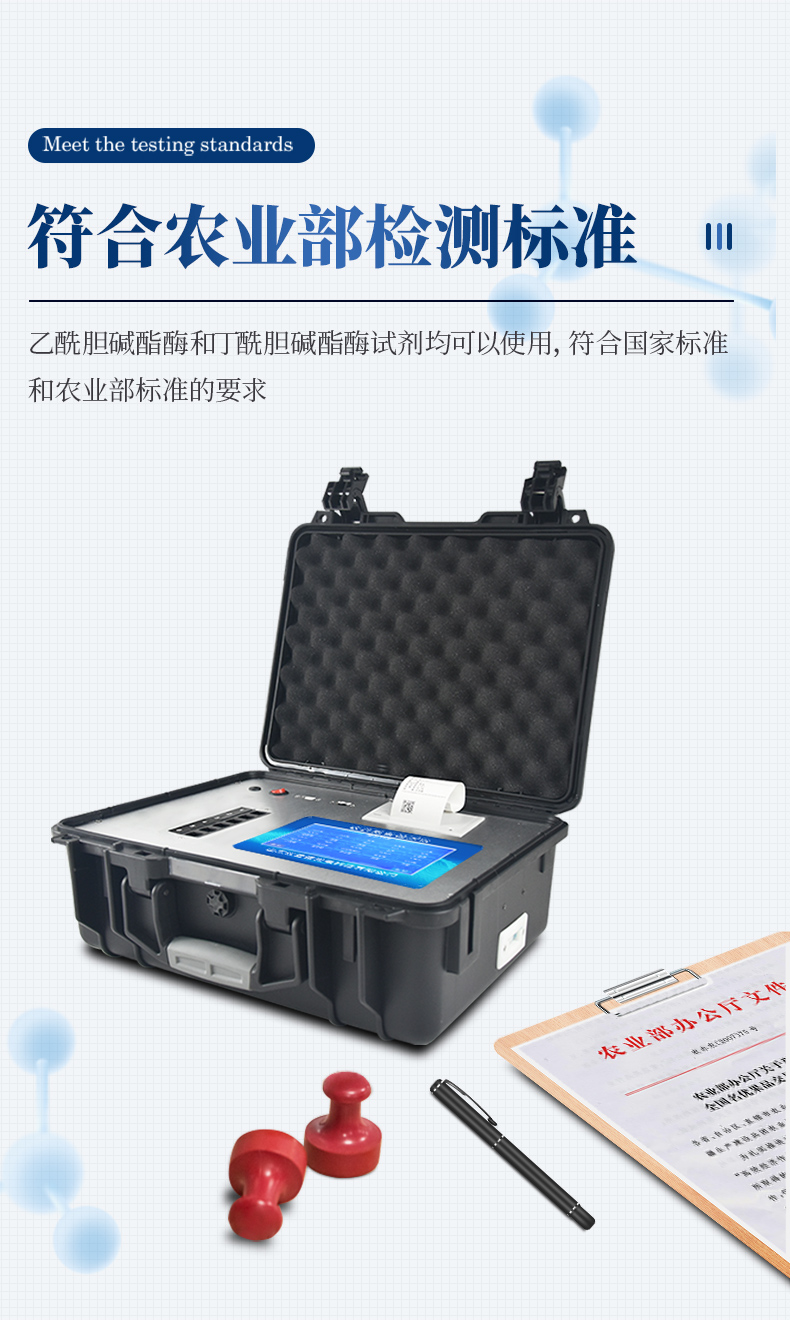 檢測標準:依據(jù)國家標準方法(GB/T5009.199-2003)以及世界衛(wèi)生組織WHO、世界糧農(nóng)組織FAO殘留農(nóng)藥檢測標準、世界環(huán)境保護局EPA參照攝入量等要求來設計。采用酶抑制率比色法對水果、蔬菜等農(nóng)產(chǎn)品中有機磷和氨基甲酸酯類農(nóng)藥含量進行快速準確的檢測。