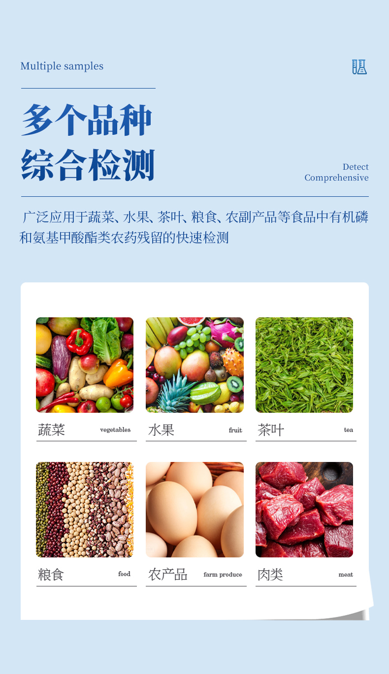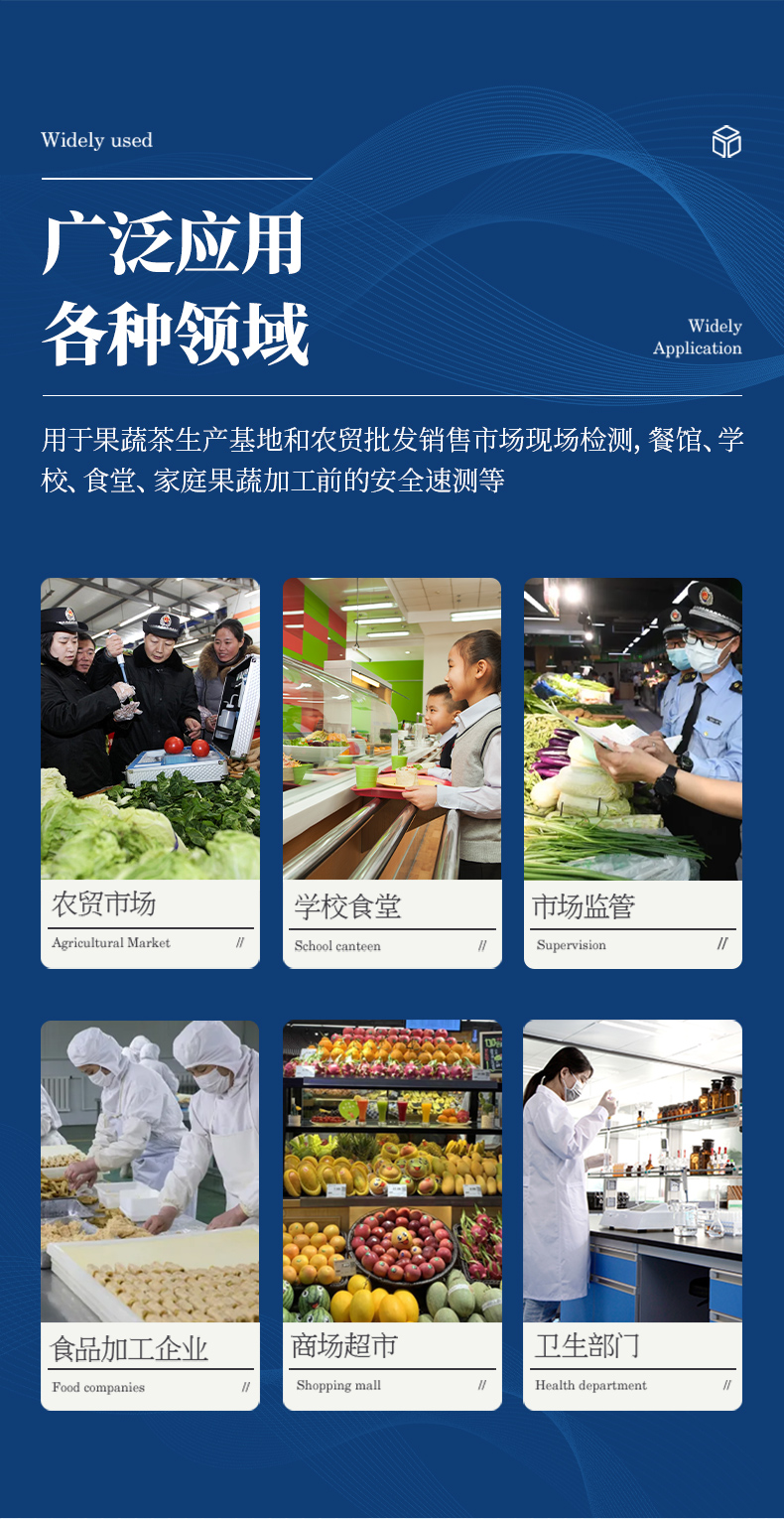廣泛應用于蔬菜、水果、茶葉、糧食、農(nóng)副產(chǎn)品等食品中有機磷和氨基甲酸酯類農(nóng)藥殘留的快速檢測;此外還可用于果蔬茶生產(chǎn)基地和農(nóng)貿(mào)批發(fā)銷售市場現(xiàn)場檢測,餐館、學校、食堂、家庭果蔬加工前的安全速測等。