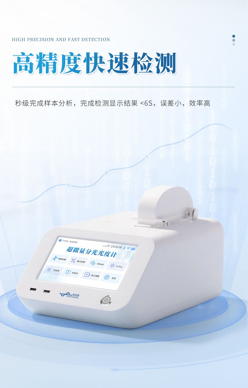 超微量分光光度計(jì)是一種基于紫外-可見(jiàn)分光光度法(UV-Vis)的高精度生物檢測(cè)儀器,專(zhuān)為極低樣本量(0.5-2μL)的核酸(DNA/RNA)、蛋白質(zhì)、細(xì)胞裂解液等生物樣品的濃度與純度快速分析設(shè)計(jì)。