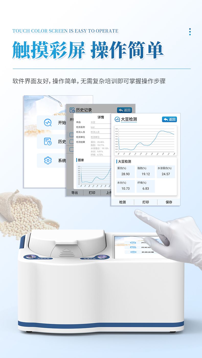 便攜式近紅外大豆蛋白儀采用先進(jìn)的近紅外光譜技術(shù),可同時(shí)無(wú)損檢測(cè)大豆中的蛋白質(zhì)、脂肪、水溶性蛋白、纖維和水分等指標(biāo)。分析過(guò)程無(wú)需復(fù)雜前處理,數(shù)十秒內(nèi)即可得出結(jié)果,極大提升了檢測(cè)效率,降低了時(shí)間和人力成本。該儀器操作智能簡(jiǎn)便,結(jié)果穩(wěn)定可靠,是糧油加工、食品檢測(cè)、育種研發(fā)和貿(mào)易收購(gòu)等領(lǐng)域進(jìn)行原料驗(yàn)收、過(guò)程控制與品質(zhì)評(píng)定的理想工具。