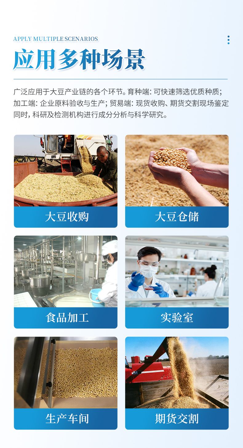 本儀器廣泛應(yīng)用于大豆產(chǎn)業(yè)鏈的各個(gè)環(huán)節(jié),為品質(zhì)管控與價(jià)值評(píng)估提供高效解決方案。在育種端,可快速篩選優(yōu)質(zhì)種質(zhì)資源;在加工端,服務(wù)于油脂、食品及飼料企業(yè)的原料驗(yàn)收與生產(chǎn)過(guò)程控制環(huán)節(jié);在貿(mào)易端,為現(xiàn)貨收購(gòu)、期貨交割實(shí)現(xiàn)現(xiàn)場(chǎng)快速定價(jià)與品質(zhì)鑒定。同時(shí),它也是科研及檢測(cè)機(jī)構(gòu)進(jìn)行成分分析與科學(xué)研究的得力工具,全面覆蓋從田間到車間的精準(zhǔn)檢測(cè)需求。