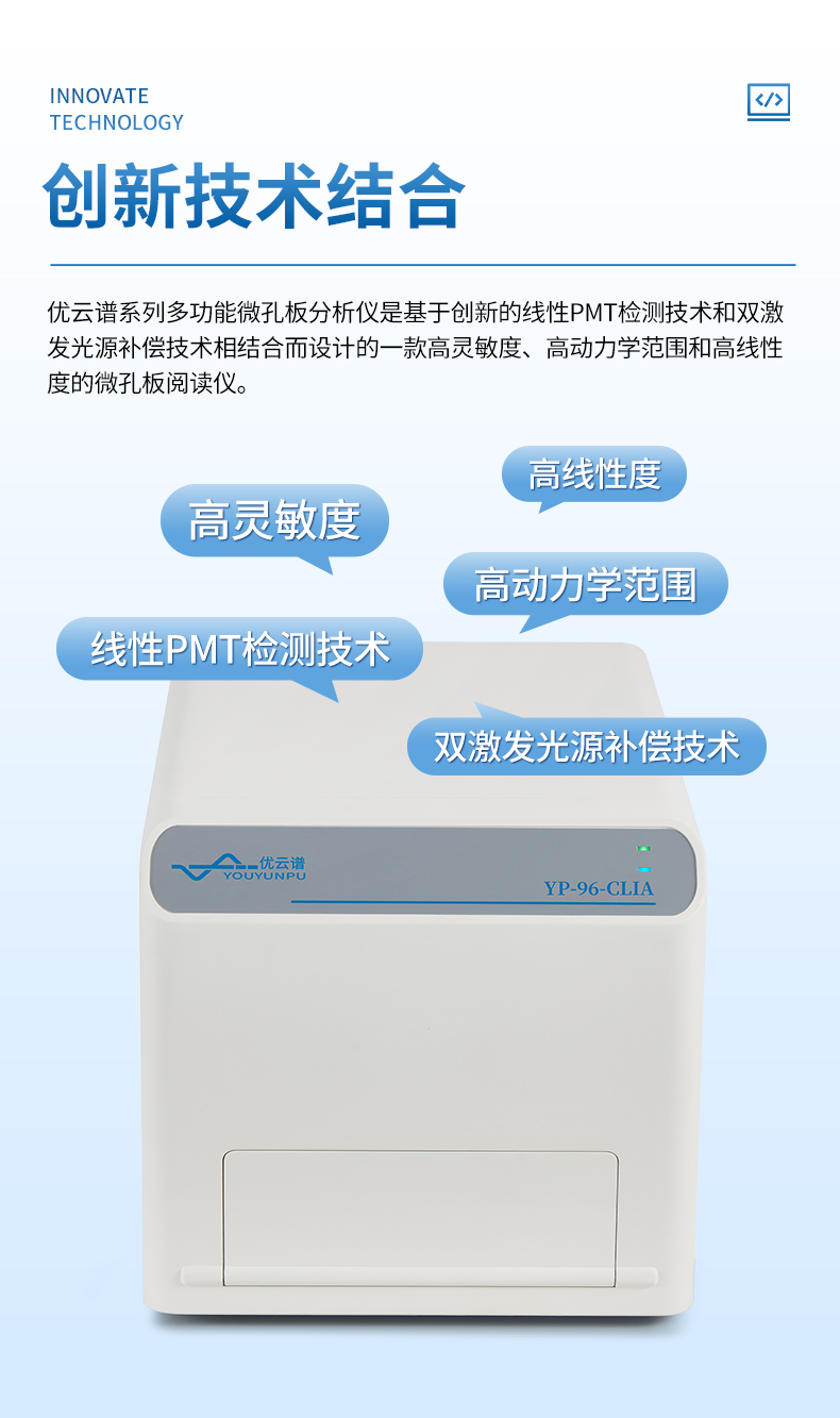 優(yōu)云譜系列多功能微孔板分析儀是基于創(chuàng)新的線性PMT檢測(cè)技術(shù)和雙激發(fā)光源補(bǔ)償技術(shù)相結(jié)合而設(shè)計(jì)的一款高靈敏度、高動(dòng)力學(xué)范圍和高線性度的微孔板閱讀儀。根據(jù)不同配置,可以實(shí)現(xiàn)化學(xué)發(fā)光(CLIA)、光激化學(xué)發(fā)光(LiCA)和時(shí)間分辨熒光(TRF)三種檢測(cè)模式。可靈活配置1到3種檢測(cè)模式,為研究人員提供一種靈活的解決方案。