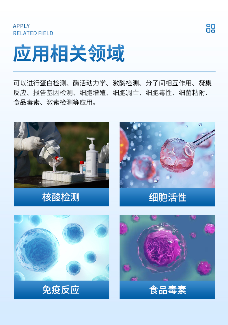 儀器廣泛應(yīng)用于核酸、免疫、細(xì)胞分析領(lǐng)域的相關(guān)研究,可以進(jìn)行蛋白檢測(cè)、酶活動(dòng)力學(xué)、激酶檢測(cè)、分子間相互作用、凝集反應(yīng)、報(bào)告基因檢測(cè)、細(xì)胞增殖、細(xì)胞凋亡、細(xì)胞毒性、細(xì)菌粘附、食品毒素及激素檢測(cè)等應(yīng)用。