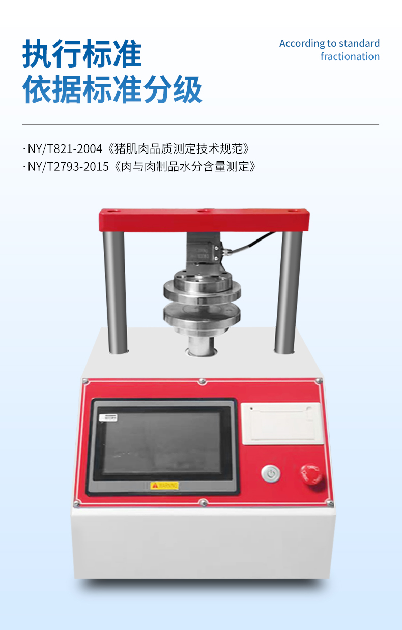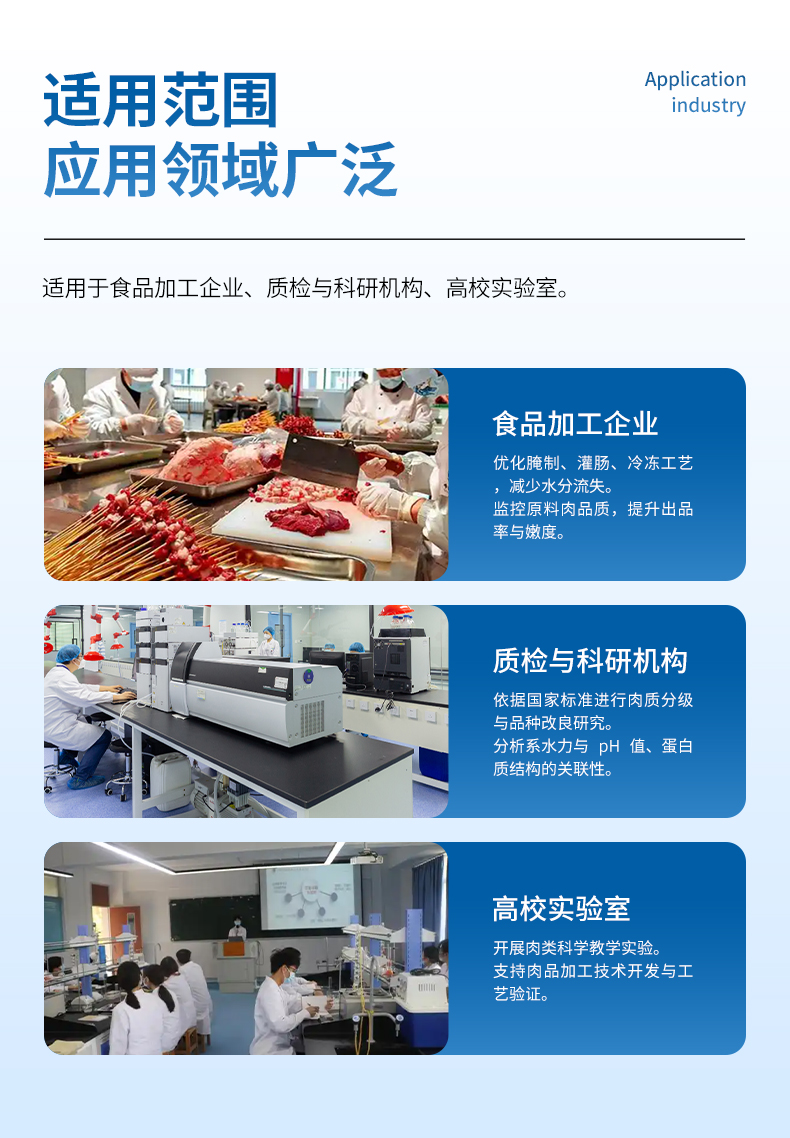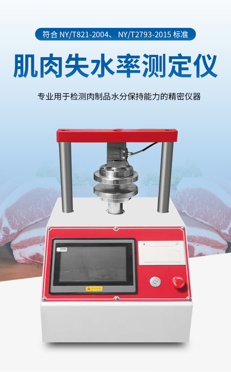 肌肉系水力的高低,取決于宰后肌肉的 PH。國內(nèi)通常采用加壓重量法來度量肌 肉失水率,以估計肌肉的系水力,即失水率越高,系水力越低。系水力(%)=(壓前肉樣重-壓后肉樣重)一壓前肉樣重 x100%。系水力:指肌肉蛋白質(zhì)在外力作用 下保持水分的能力采用貯存損失 熟肉率及失水率測定肌肉的系水力。應用于食品包裝廠家、質(zhì)檢、商檢、大學、 科研等部門。