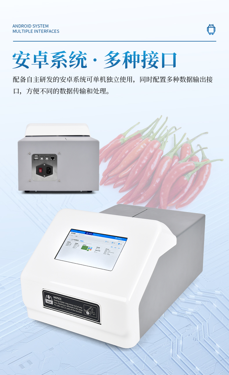 辣椒素檢測儀主要用于各種辣椒及辣椒制品中的天然辣椒素、辣度檢測。儀器由亮度發(fā)光二管光源、比色池、高靈敏度集成光電池、微處理器、漢字大屏幕液晶屏、嵌入式微型熱敏打印機集成芯片構(gòu)成,可直接在大屏幕液晶屏上顯示出被測樣品中相關(guān)指標的含量,并打印出分析結(jié)果,還可以通過計算機接口將數(shù)據(jù)傳輸?shù)诫娔X進行數(shù)據(jù)分析。