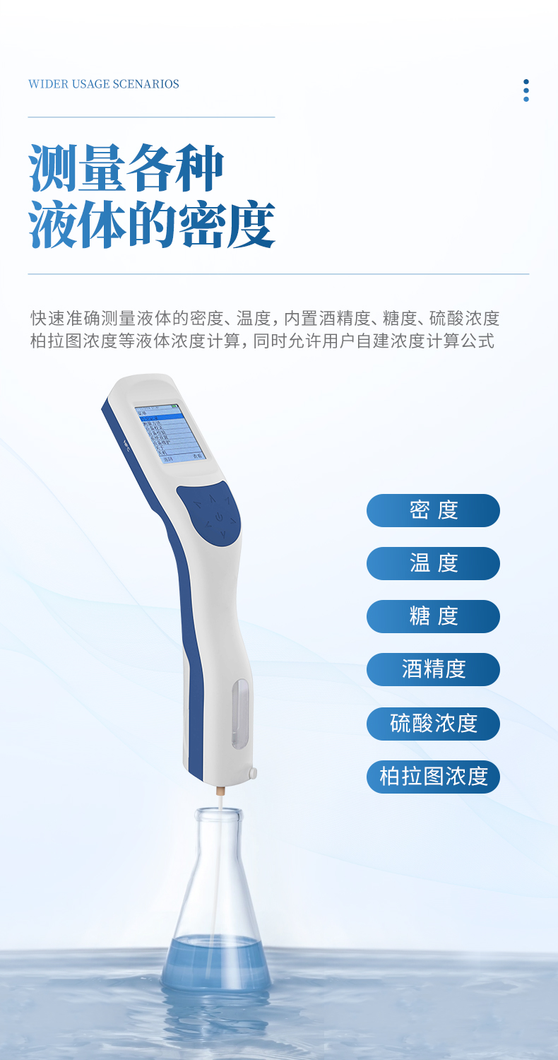儀器可以快速準(zhǔn)確測量液體的密度、溫度,內(nèi)置酒精度、糖度、硫酸濃度、柏拉圖濃度等液體濃度計算,同時允許用戶自建濃度計算公式。