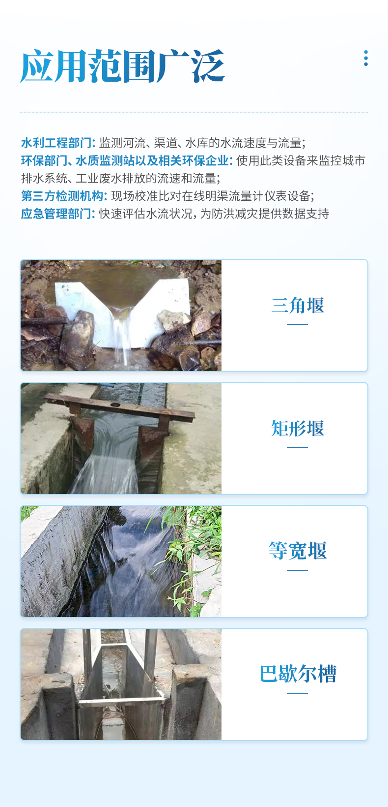 水利工程部門:監(jiān)測河流、渠道、水庫的水流速度與流量;