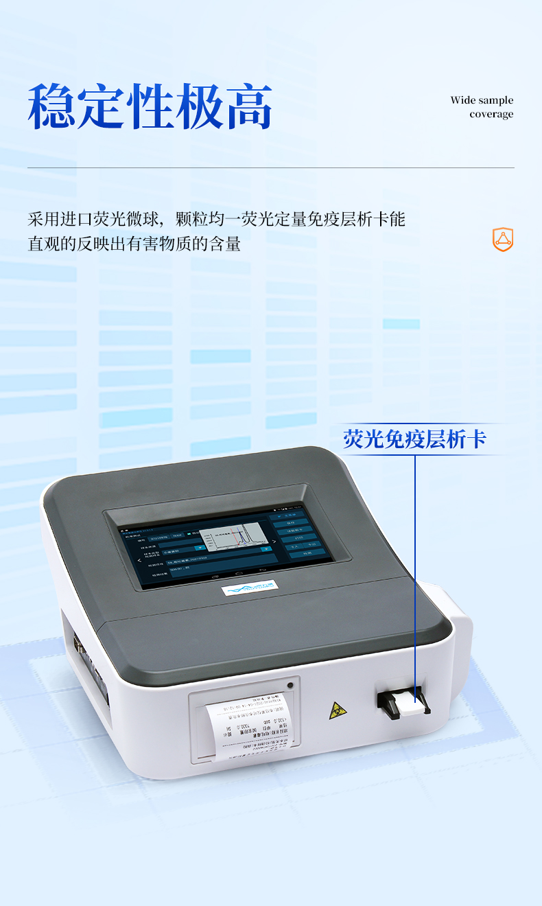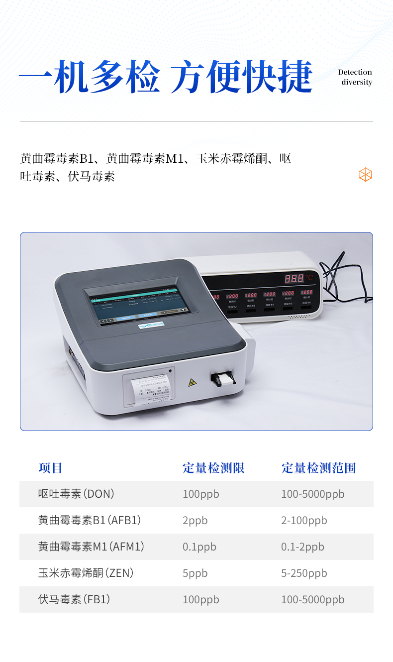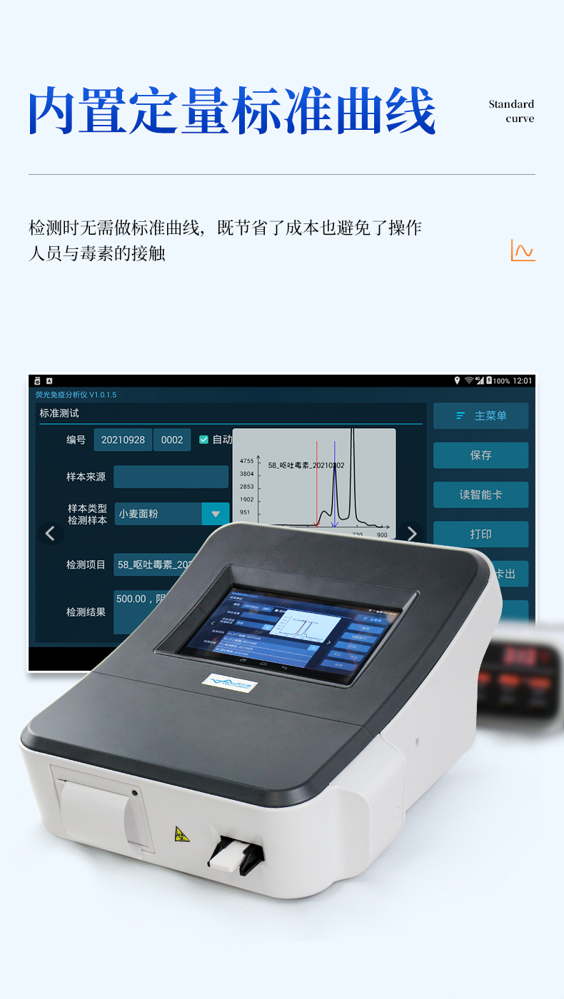 3、內(nèi)置定量標(biāo)準(zhǔn)曲線:儀器內(nèi)置標(biāo)準(zhǔn)曲線,無需使用標(biāo)準(zhǔn)品,檢測(cè)時(shí)無需做標(biāo)準(zhǔn)曲線,既節(jié)省了成本,也避免了操作人員與嘔吐毒素的接觸,保護(hù)操作人員的安全;