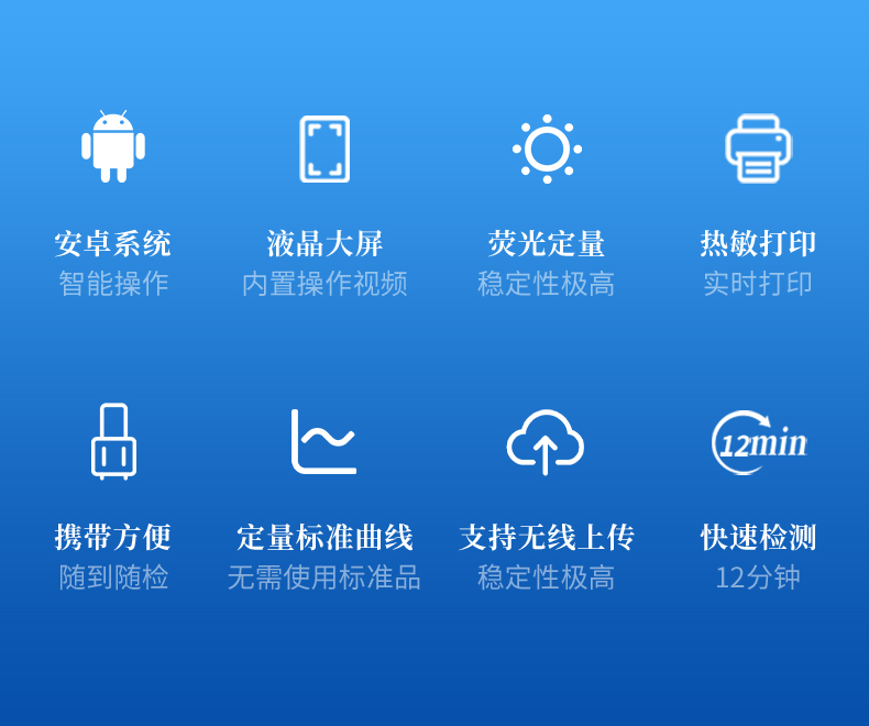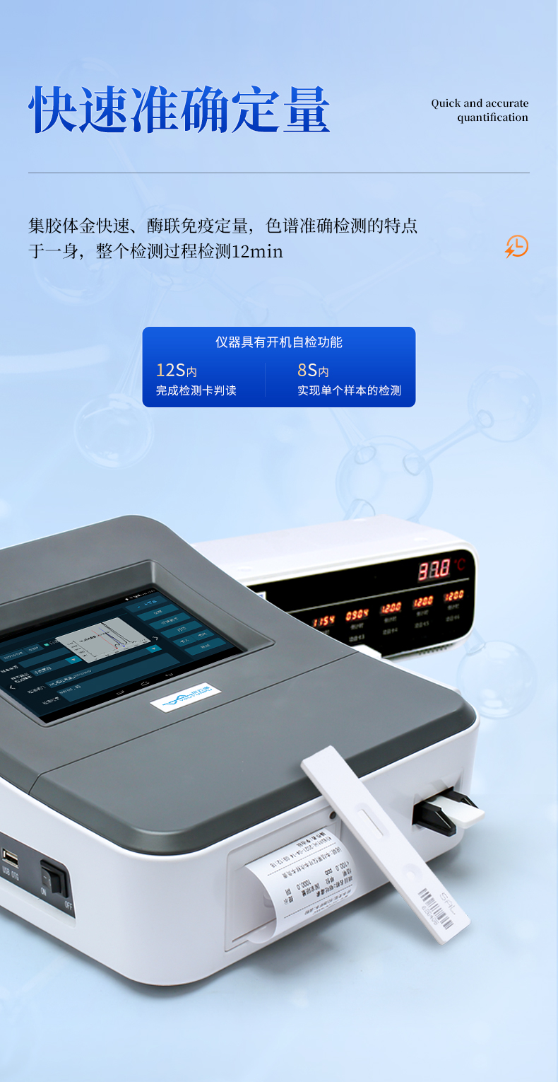 2、快速準(zhǔn)確定量:集膠體金快速,酶聯(lián)免疫定量、色譜準(zhǔn)確檢測(cè)的特點(diǎn)于一身,實(shí)現(xiàn)快速準(zhǔn)確定量檢測(cè);