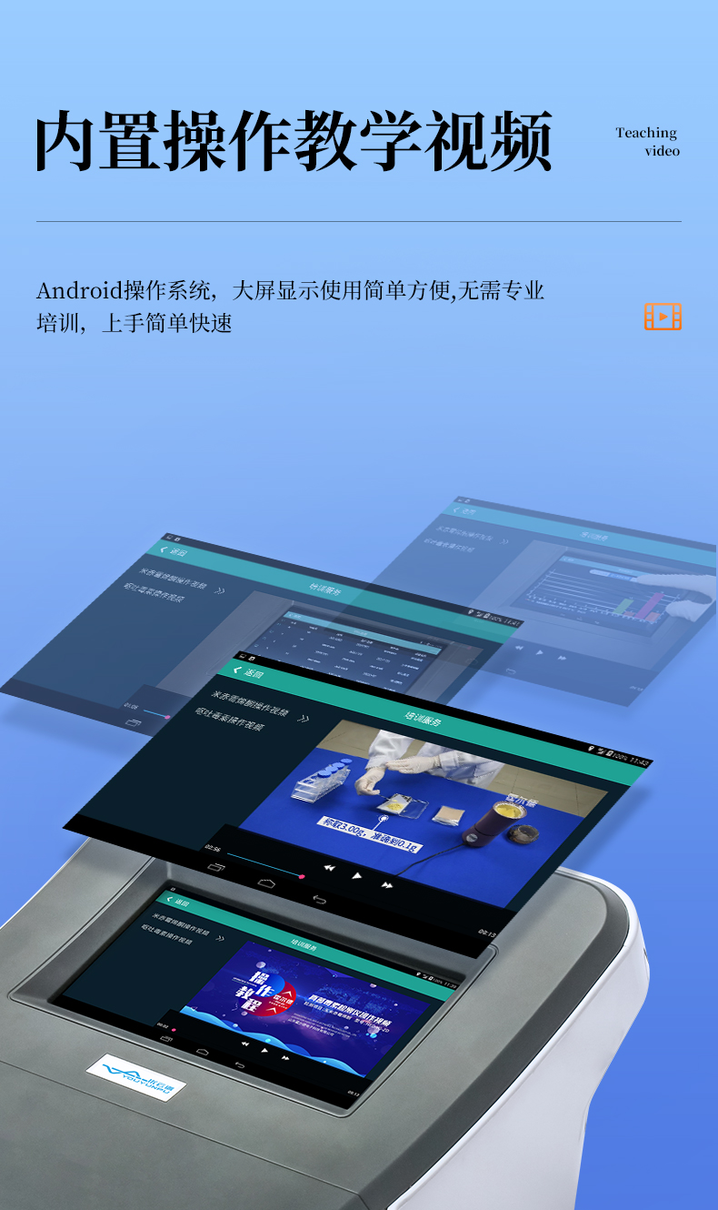 7、使用簡(jiǎn)單方便:儀器內(nèi)置檢測(cè)項(xiàng)目操作視頻,無需專業(yè)培訓(xùn),邊觀看儀器內(nèi)置操作視頻,邊做實(shí)驗(yàn),上手簡(jiǎn)單快速。