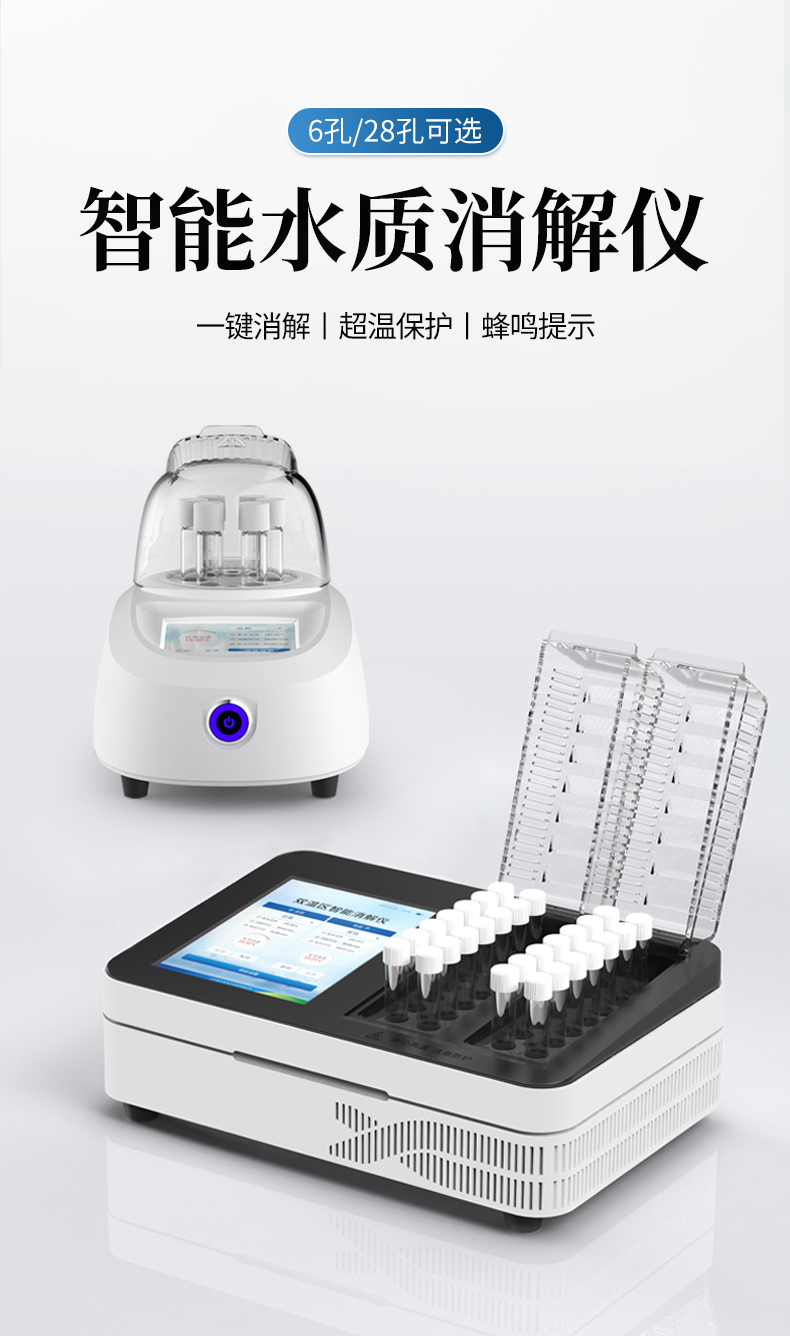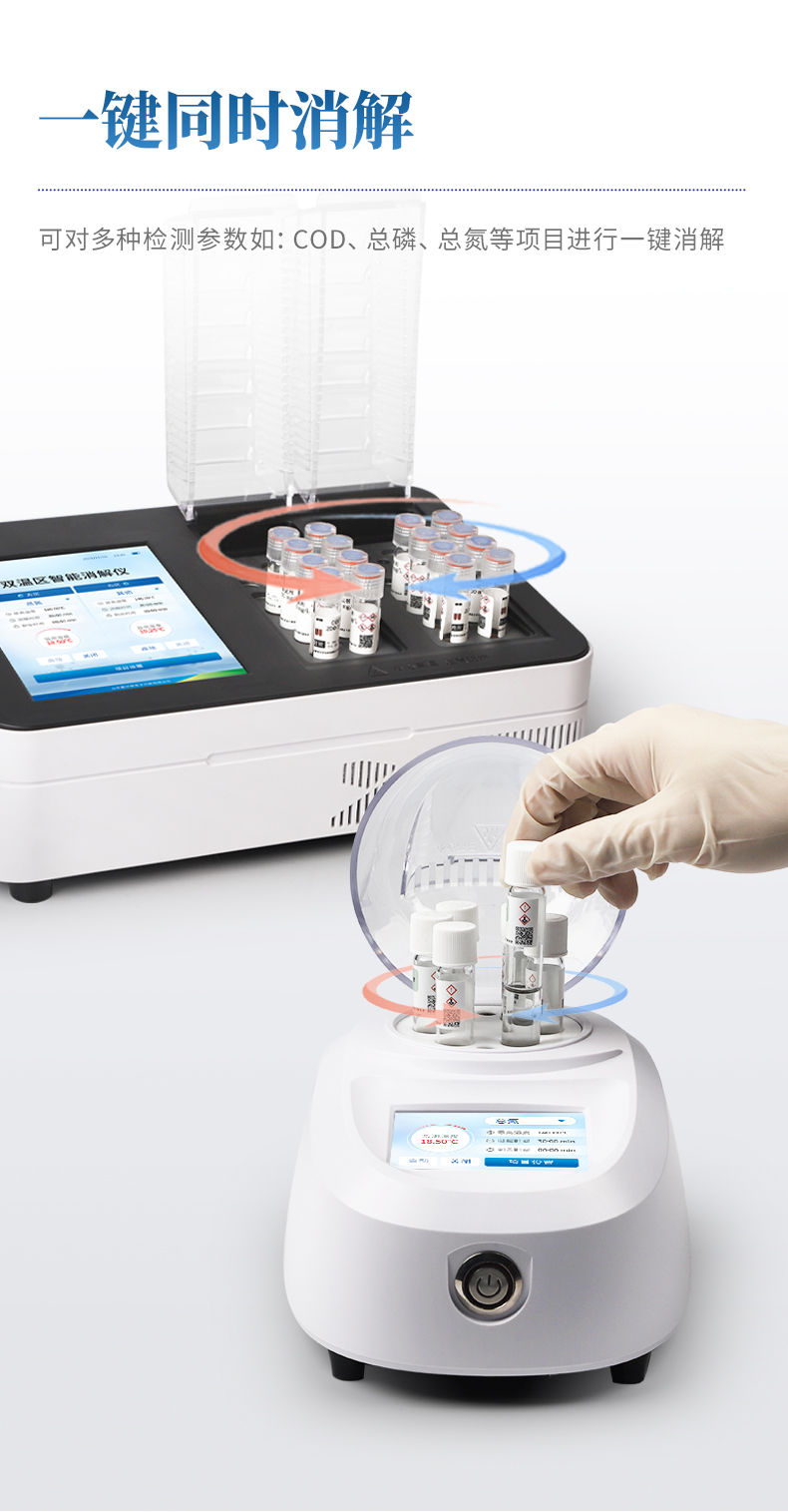 YP-X06型便攜式智能消解儀是一款依據(jù)環(huán)保行業(yè)標準《HJ/T399-2007》研發(fā)的新款多功能快速消解儀,搭載3.5寸電容觸屏操作,智能安全,升溫速度快,溫度均勻穩(wěn)定,可對多種檢測參數(shù)如:COD、總磷、總氮等項目進行一鍵消解。