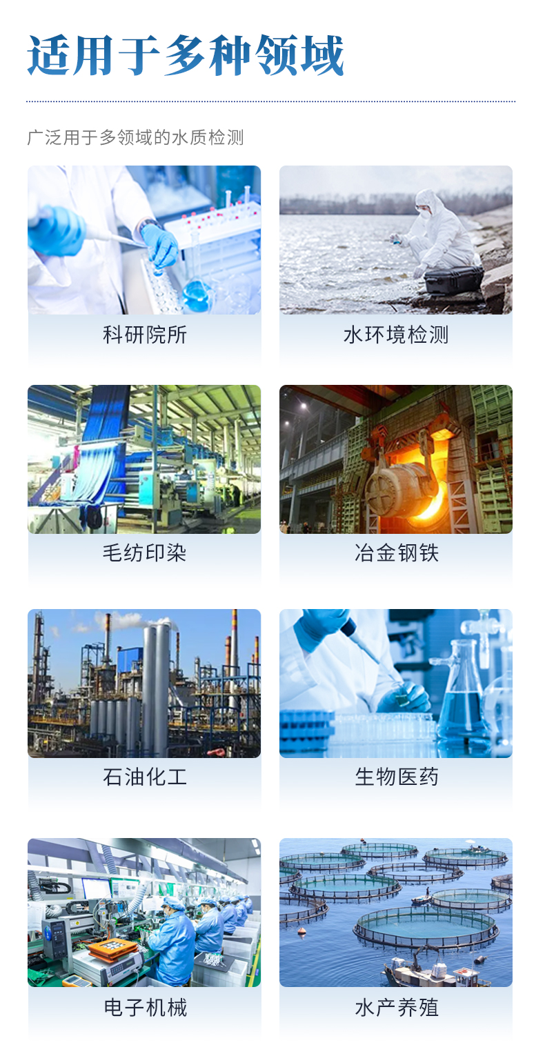 YP-X06型便攜式智能消解儀可廣泛應(yīng)用于科研院所、污水工程、水環(huán)境檢測、石油化工、冶金鋼鐵、生物醫(yī)藥、食品乳業(yè)、毛紡印染、電子機械、水產(chǎn)養(yǎng)殖、光伏、皮革、造紙等領(lǐng)域的水質(zhì)檢測。