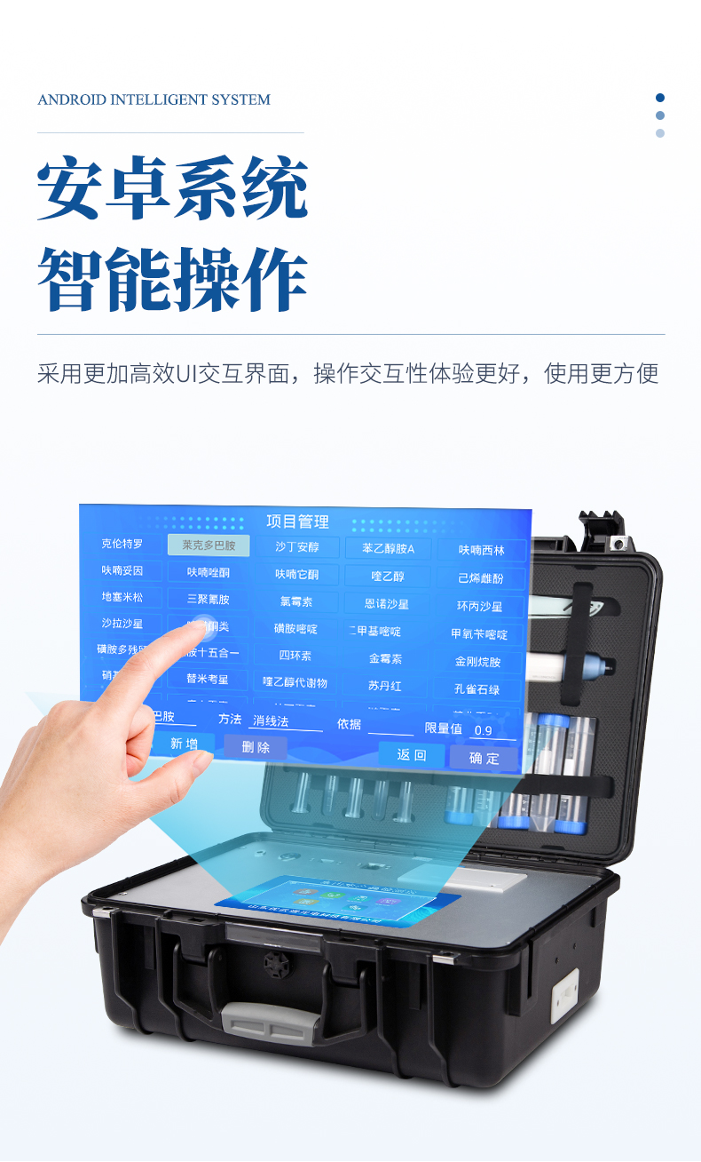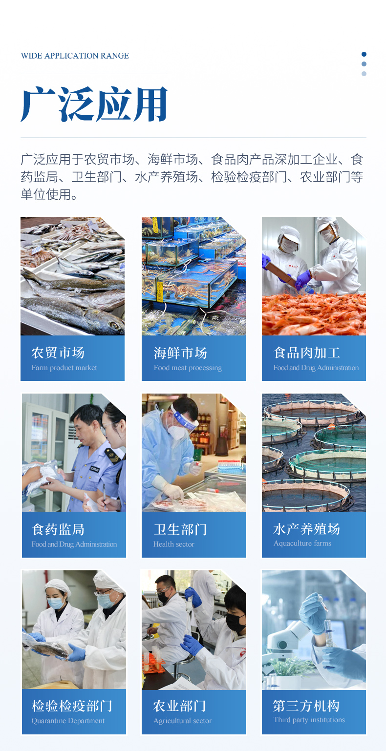 該設備可快速檢測魚、蝦等水產類中的氯霉素、孔雀石綠、四環(huán)素類、硝基呋喃類、磺胺類、喹諾酮沙星類;添加劑類甲醛、雙氧水、工業(yè)堿、過氧化苯甲酰、草酸等;重金屬鉛、鉻、鎘、汞、砷等快速檢測,該快速檢測系統(tǒng)設備利用抑制免疫層析的原理和光電比色法,為集成化食品安全快速檢測分析設備,廣泛應用于養(yǎng)殖場、屠宰場、食品肉產品深加工企業(yè)、檢驗檢疫部門、食藥監(jiān)局、衛(wèi)生部門、高教院校、科研院所、農業(yè)部門等單位使用。