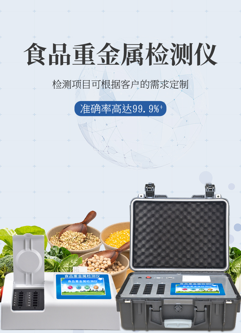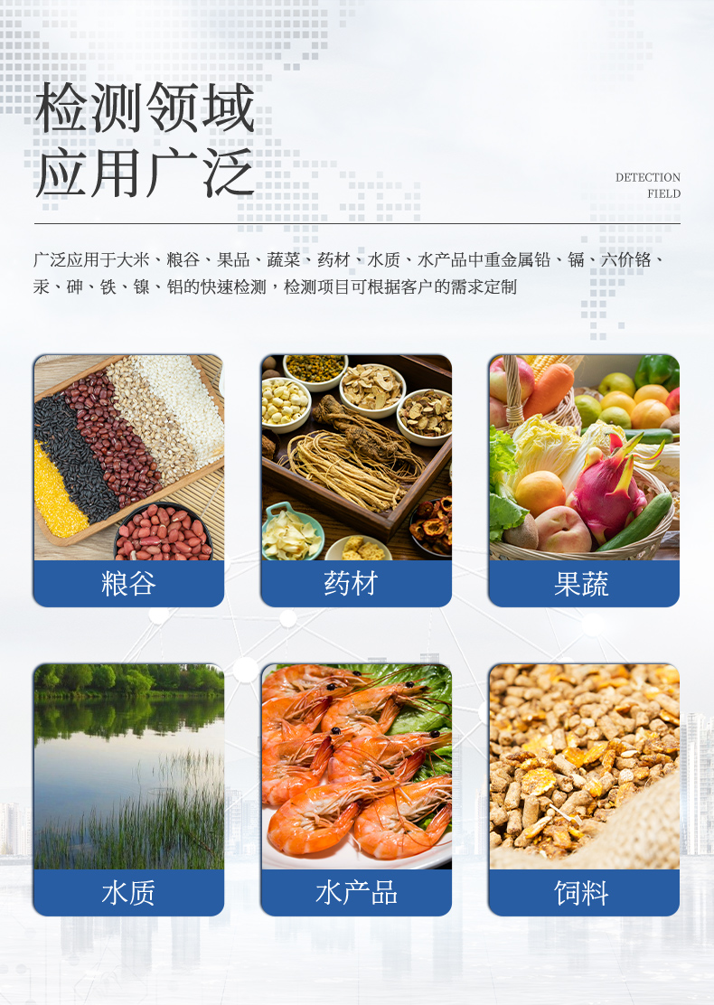 YP-BZ08重金屬檢測(cè)儀可廣泛應(yīng)用于大米、糧谷、果品、蔬菜、藥材、水質(zhì)、水產(chǎn)品中重金屬鉛、鎘、六價(jià)鉻、汞、砷、鐵、鎳、鋁的快速檢測(cè),檢測(cè)項(xiàng)目可根據(jù)客戶(hù)的需求定制。