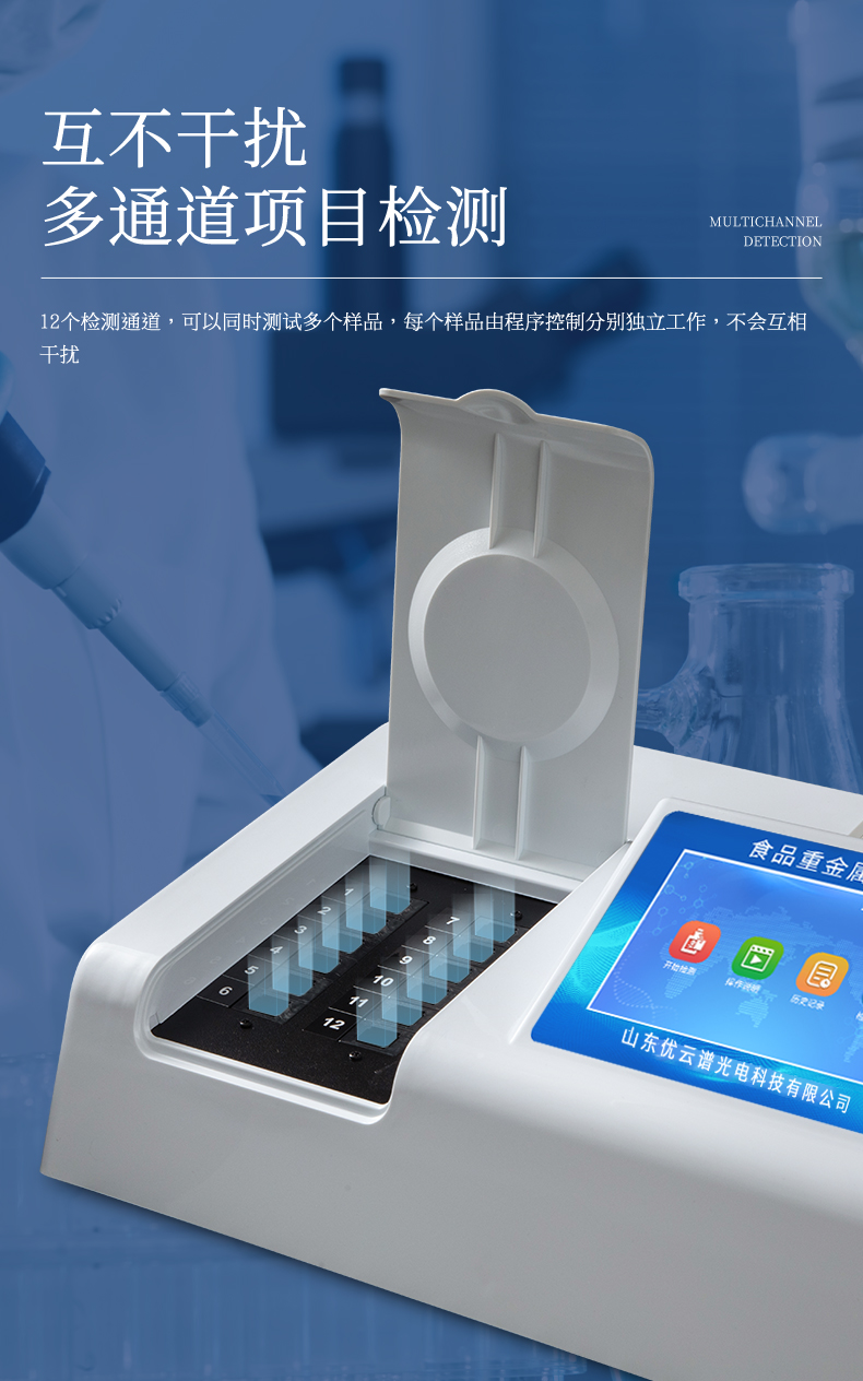 6、檢測(cè)通道:12檢測(cè)通道,可以同時(shí)測(cè)試多個(gè)樣品,每個(gè)樣品由程序控制分別獨(dú)立工作,不會(huì)互相干擾。