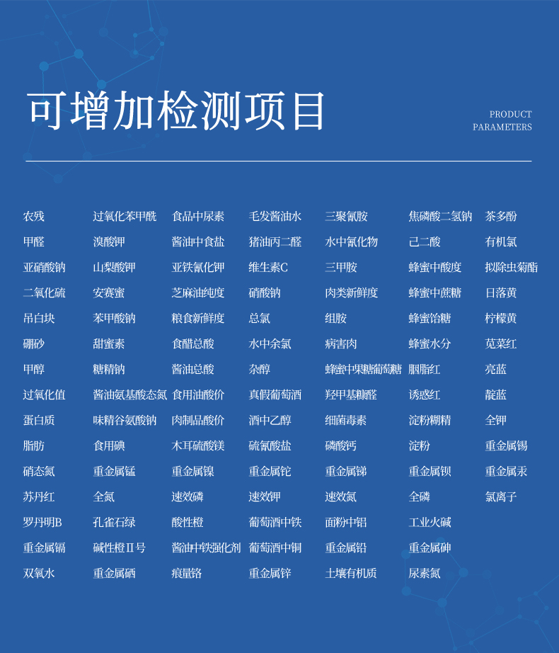 5、具有多個(gè)食品安全檢測(cè)項(xiàng)目,開(kāi)放平臺(tái),可以增減檢測(cè)項(xiàng)目。