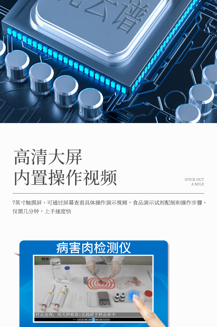 可快速檢測病害肉、組胺、揮發(fā)性鹽基氮,儀器預(yù)留其他項目檢測程序和端口,根據(jù)日后需求可方便的自主增加檢測項目。