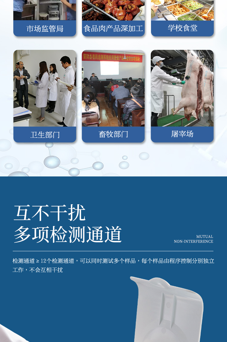 該多功能食品安全檢測儀為集成一體化食品安全快速檢測分析設(shè)備,廣泛應(yīng)用于市場監(jiān)管局、食品肉產(chǎn)品深加工企業(yè)、學(xué)校食堂、衛(wèi)生部門、畜牧部門、屠宰場、檢驗檢疫部門等單位使用。