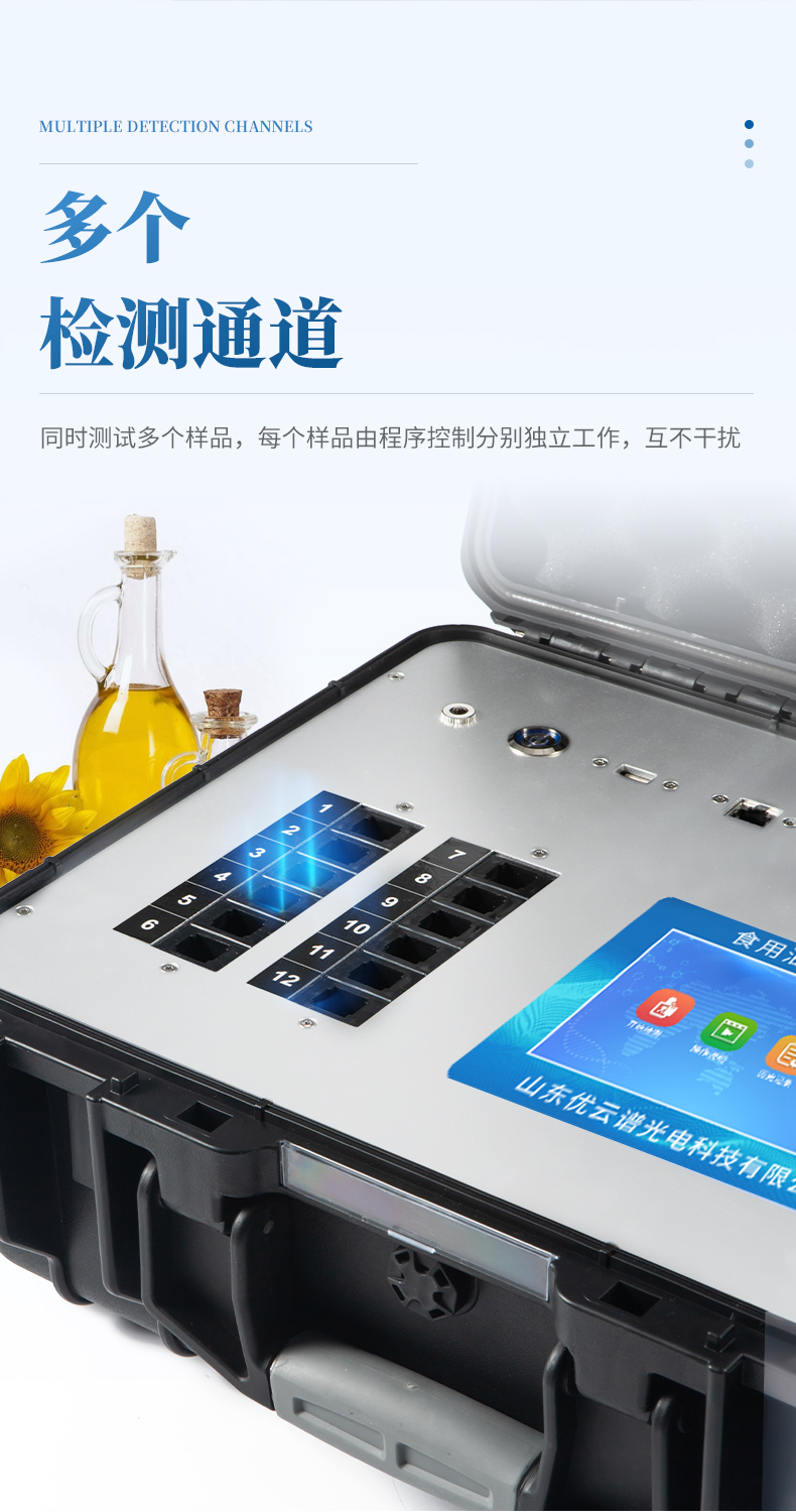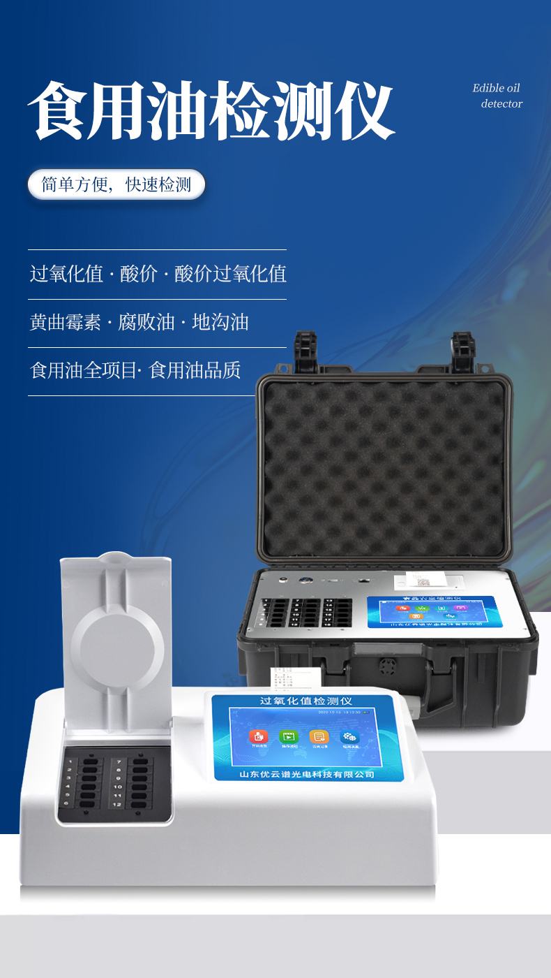 食用油綜合檢測檢測儀為集成化油品快速檢測分析設(shè)備,能夠快速檢測食用植物油、食用豬油、花生油、葵花油、米糠油、食品、肉制品中的酸價、過氧化值、黃曲霉毒素等含量;通過檢測可確定植物油是否符合國家標(biāo)準(zhǔn)或是否為酸敗油、劣質(zhì)油、地溝油等。儀器預(yù)留其他項目檢測程序和端口,根據(jù)日后需求可方便的自主增加檢測項目。日后可升級為檢測水產(chǎn)品、面制品的綜合類型儀器。
