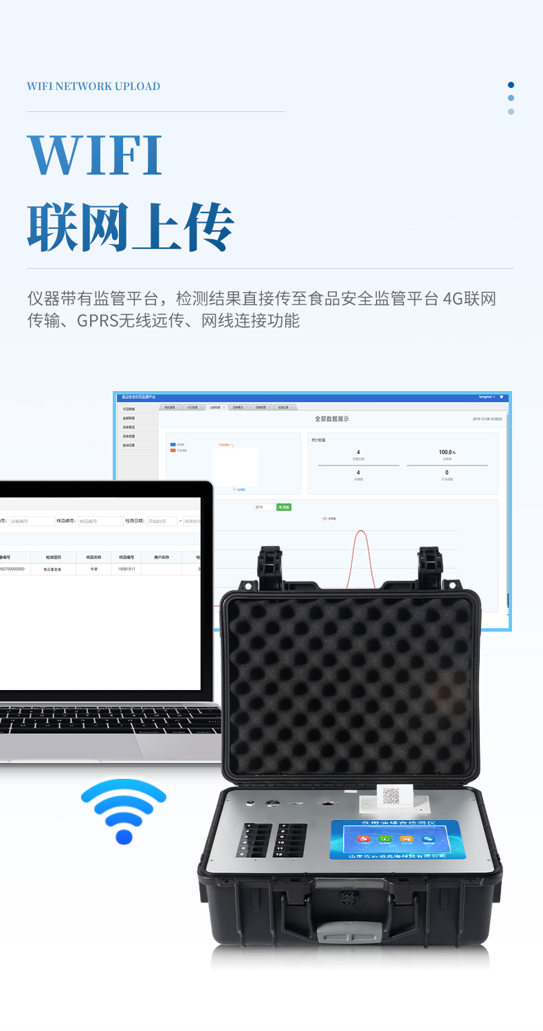 4、儀器帶有監(jiān)管平臺,數(shù)據(jù)可局域網(wǎng)和互聯(lián)網(wǎng)數(shù)據(jù)上傳,檢測結(jié)果直接傳至食品安全監(jiān)管平臺。進行區(qū)域食品安全監(jiān)管及大數(shù)據(jù)分析處理與數(shù)據(jù)統(tǒng)計,檢測區(qū)域食品安全長短期動態(tài),達到食品安全問題預(yù)估、預(yù)警