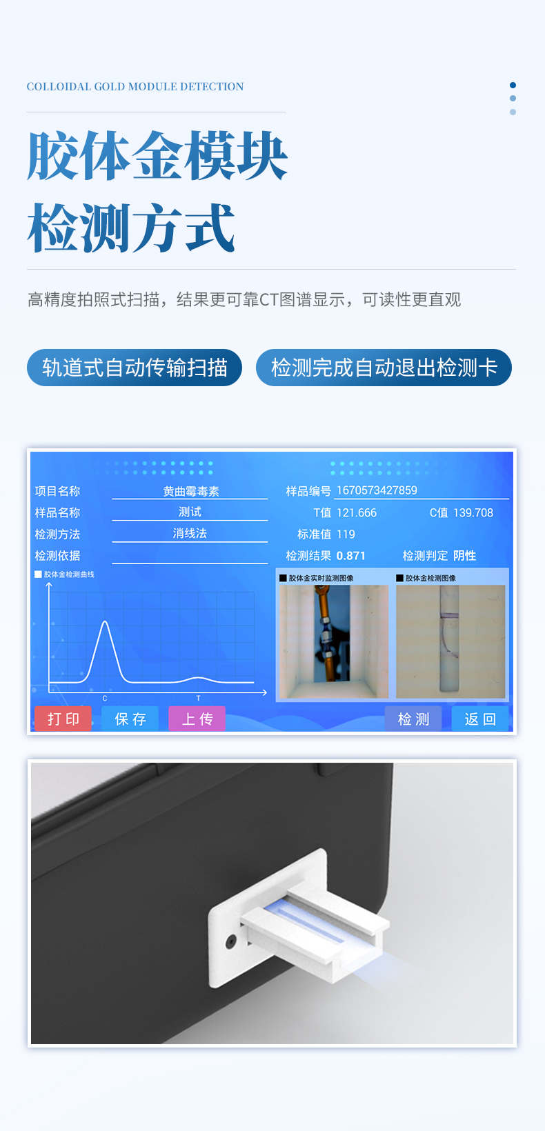 7、膠體金模塊檢測方式:軌道式自動傳輸掃描,檢測完成后自動退出檢測卡。