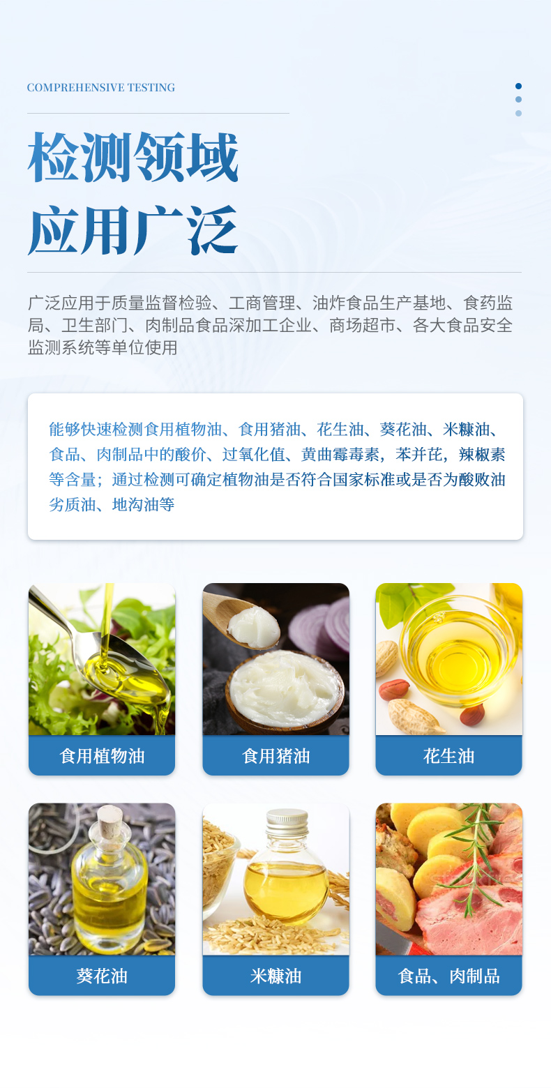 廣泛應(yīng)用于質(zhì)量監(jiān)督檢驗、工商管理、油炸食品生產(chǎn)基地、食藥監(jiān)局、衛(wèi)生部門、肉制品食品深加工企業(yè)、農(nóng)業(yè)部門、檢驗檢疫部門、商場超市、各大食品安全監(jiān)測系統(tǒng)等單位使用。
