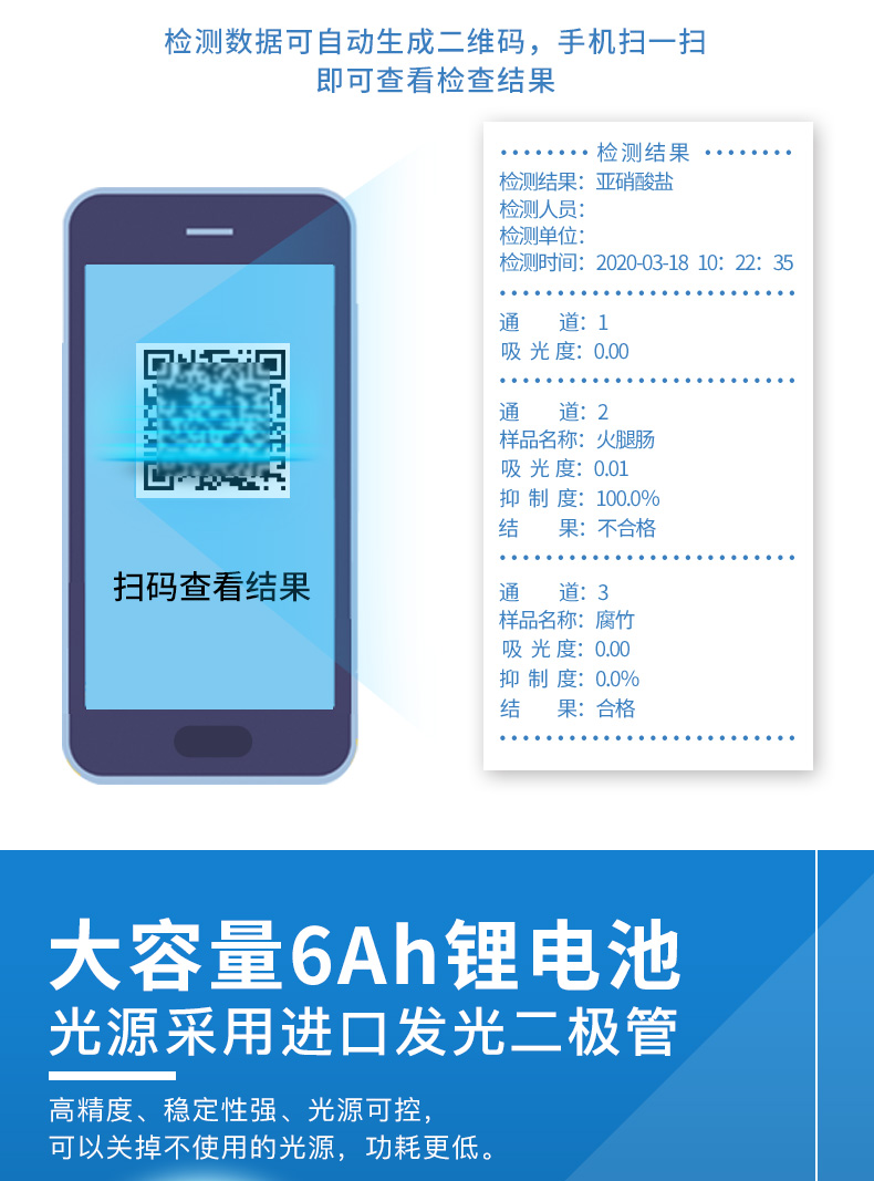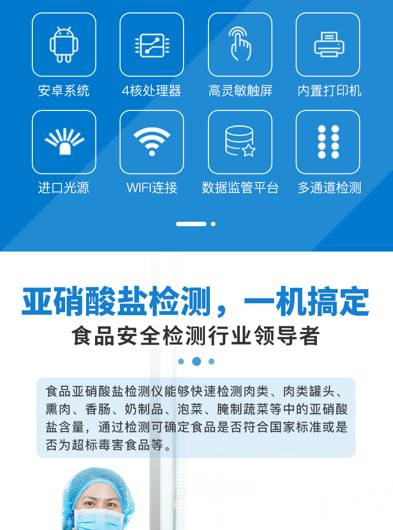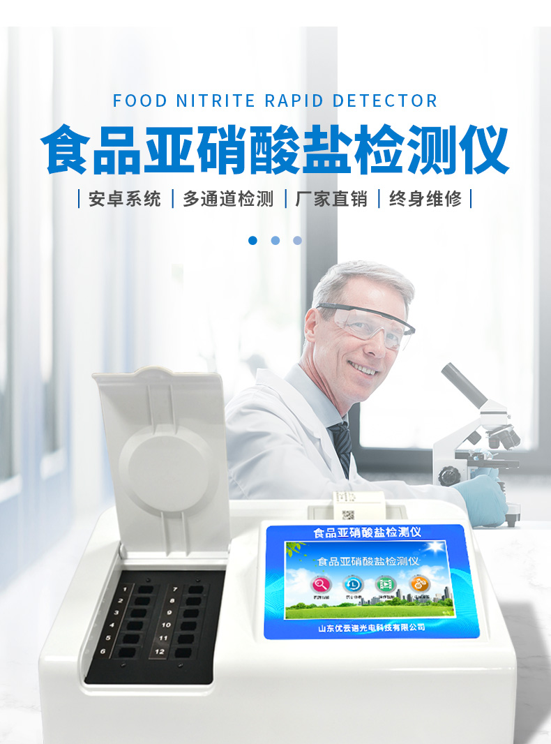 YP-Y12食品中亞硝酸鹽快速檢測儀為集成化食品安全檢測分析設(shè)備,能夠快速檢測肉類、肉類罐頭、熏肉、香腸、奶制品、泡菜、腌制蔬菜等中的亞硝酸鹽含量;該儀器是根據(jù)GB5009.33-2010《食品中亞硝酸鹽與硝酸鹽的測定》,食品中的亞硝酸鹽經(jīng)過提取,與檢測試劑反應(yīng)生成有色化合物,再利用亞硝酸鹽檢測儀測定其吸光度,在一定范圍內(nèi)吸光度與含量成正比。通過檢測可確定食品是否符合國家標(biāo)準(zhǔn)或是否為超標(biāo)毒害食品等。儀器預(yù)留其他項目檢測程序和端口,根據(jù)日后需求可方便的自主增加檢測項目。日后可升級為檢測水產(chǎn)品、面制品的綜合類型儀器。