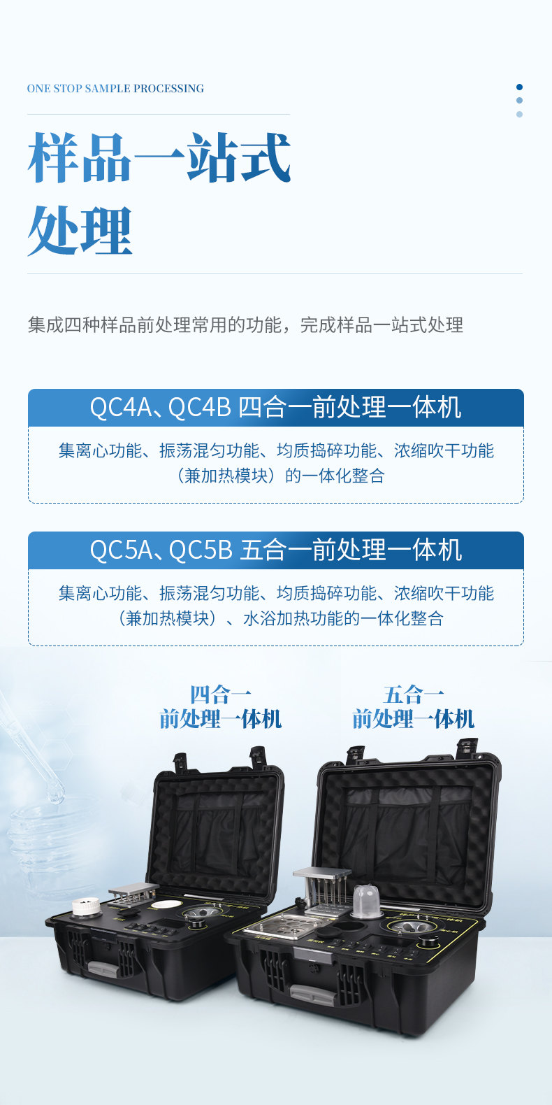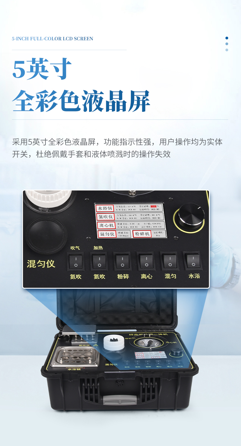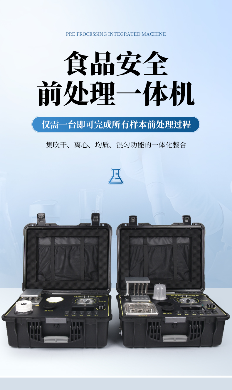 QC4型四合一樣品檢測前處理一體機(箱)是集吹干、離心、均質(zhì)、混勻功能的一體化整合,極大的簡化和集中樣品前處理的一般操作過程,結(jié)合移動便攜的工程塑料箱體,特別適合農(nóng)獸藥殘留畜禽水產(chǎn)品質(zhì)量安全現(xiàn)場快速檢測。