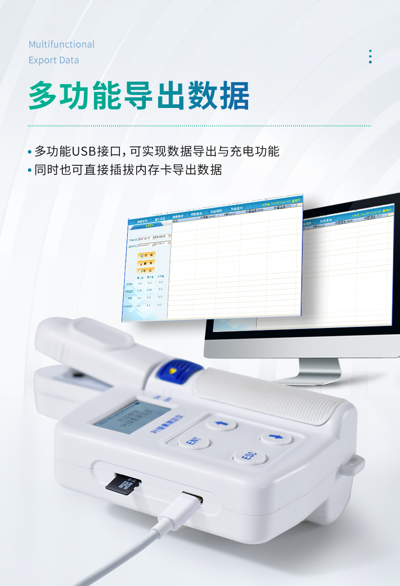 5.多功能USB接口,可實(shí)現(xiàn)數(shù)據(jù)導(dǎo)出與充電功能,可將儀器與電腦直接聯(lián)機(jī),數(shù)據(jù)導(dǎo)出無需上位機(jī)軟件,還可選擇使用內(nèi)存卡直接導(dǎo)出數(shù)據(jù),操作簡(jiǎn)單方便