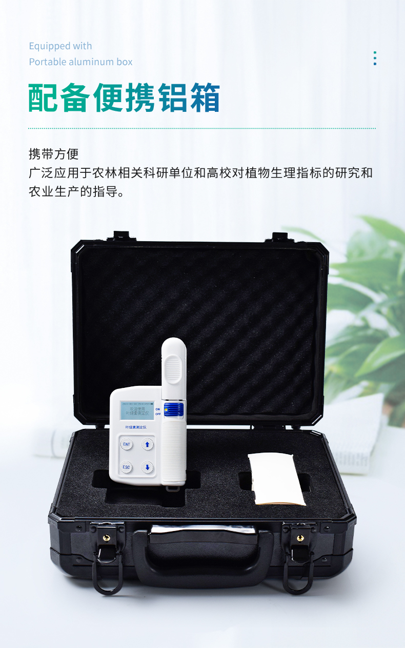 植物養(yǎng)分測(cè)定儀可以即時(shí)無損測(cè)量植物的葉綠素相對(duì)含量(單位 SPAD)或綠色程度、氮含量、葉面濕度、葉面溫度,從而了解植物真實(shí)的硝基需求量并且了解土壤硝基的缺乏程度或是否過多地施加了氮肥??梢酝ㄟ^此款儀器來增加氮肥的利用率,并可保護(hù)環(huán)境。可廣泛應(yīng)用于農(nóng)林相關(guān)科研單位和高校對(duì)植物生理指標(biāo)的研究和農(nóng)業(yè)生產(chǎn)的指導(dǎo)。