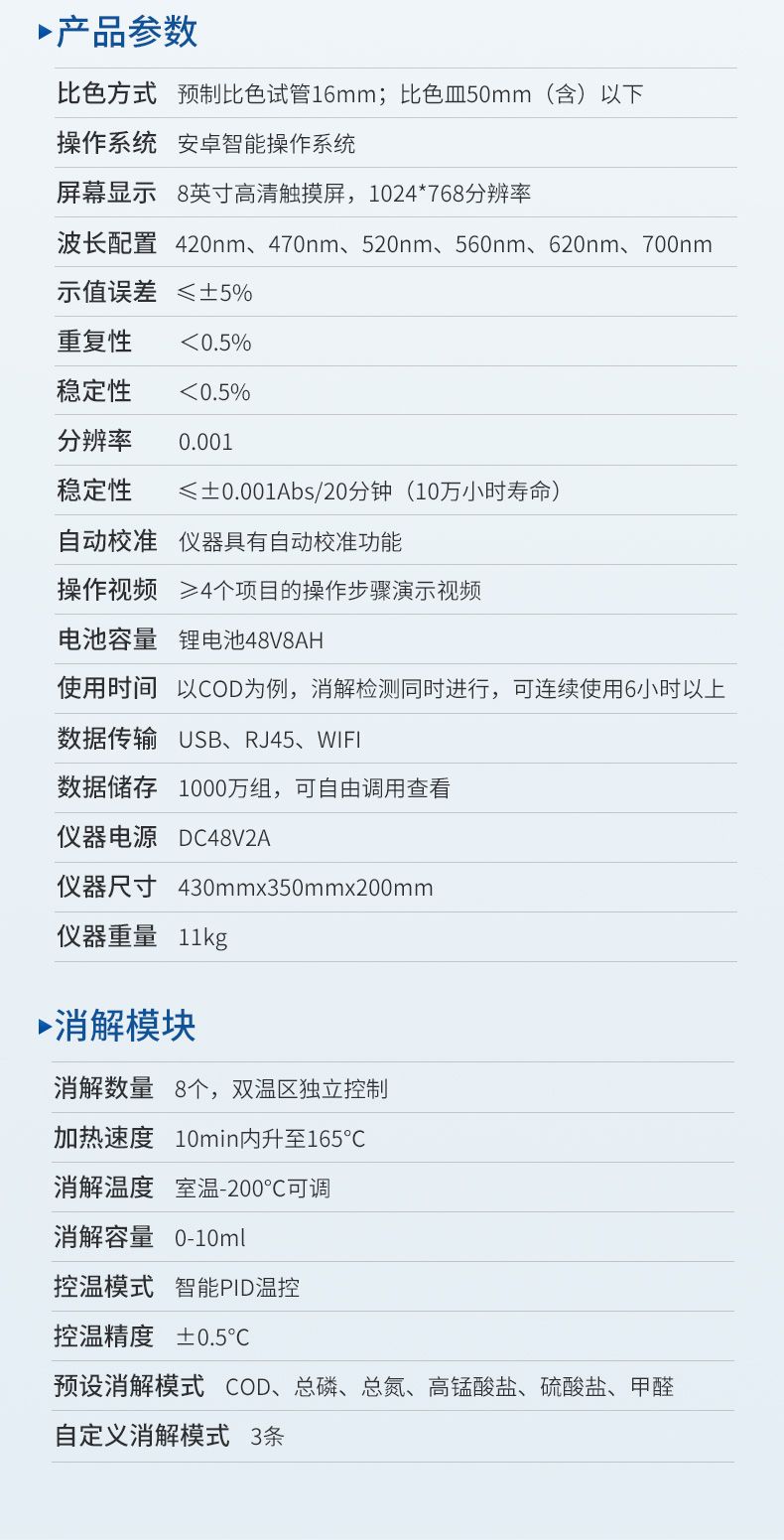 4、內(nèi)置雙溫區(qū)8孔消解儀,左右溫區(qū)獨(dú)立控制,可對COD總磷總氮等進(jìn)行快速消解。