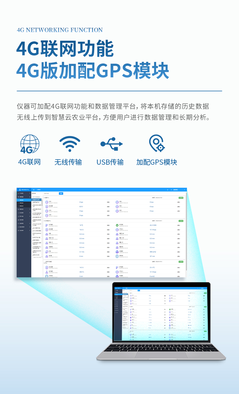 7、儀器配備4G聯(lián)網(wǎng)功能數(shù)據(jù)管理平臺,將本機存儲的被測點環(huán)境因子測量歷史數(shù)據(jù)無線上傳到智慧云農(nóng)業(yè)平臺,方便用戶進行數(shù)據(jù)管理和長期分析。