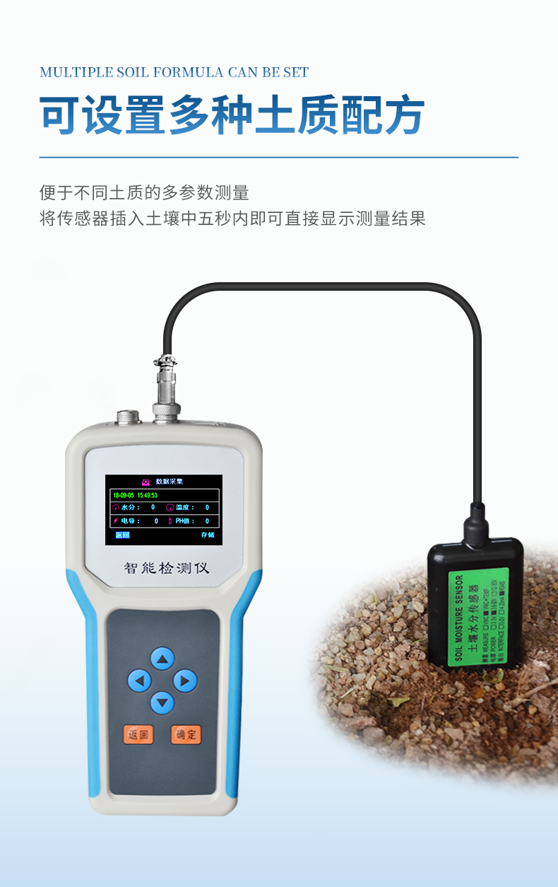 土壤水分溫度鹽分PH測定儀采用一體化結(jié)構(gòu)設計,可快速準確測量土壤中含水量、溫度、電導率(鹽分)、酸堿度,可對多處樣地、不同土壤深度的水分含量溫度鹽分和PH進行快速檢測和長期連續(xù)監(jiān)測。