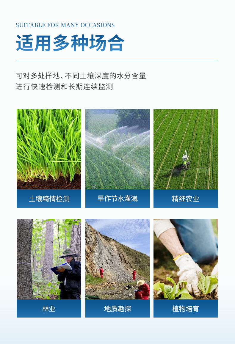 廣泛應用于土壤墑情檢測、旱作節(jié)水灌溉、精細農(nóng)業(yè)、林業(yè)、地質(zhì)勘探、植物培育、水利、環(huán)保等領域。