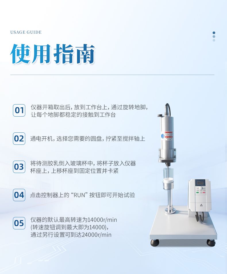 儀器開箱取出后,放到工作臺上,通過旋轉(zhuǎn)地腳,讓每個地腳都穩(wěn)定的接觸到工作臺,通電開機(jī),選擇您需要的圓盤,擰緊至攪拌軸上,將待測膠乳倒入玻璃杯中,將杯子放入儀器杯座上,上移杯座到固定位置并卡緊,點擊控制器上面的“RUN”按鈕即可開始試驗。儀器的默認(rèn)最高轉(zhuǎn)速為14000r/min(轉(zhuǎn)速旋鈕調(diào)到最大即為14000),通過另行設(shè)置可到達(dá)24000r/min。