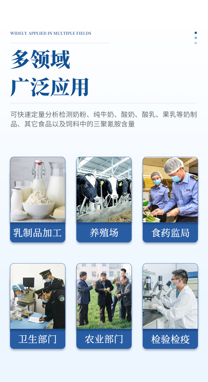三聚氰胺檢測儀可快速定量分析檢測奶粉、純牛奶、酸奶、酸乳、果乳等奶制品、其它食品以及飼料中的三聚氰胺含量。從原料采購到成品檢驗均可使用,三聚氰胺檢測儀廣泛應(yīng)用于乳制品加工、養(yǎng)殖場、食藥監(jiān)局、衛(wèi)生部門、農(nóng)業(yè)部門、檢驗檢疫等部門使用。