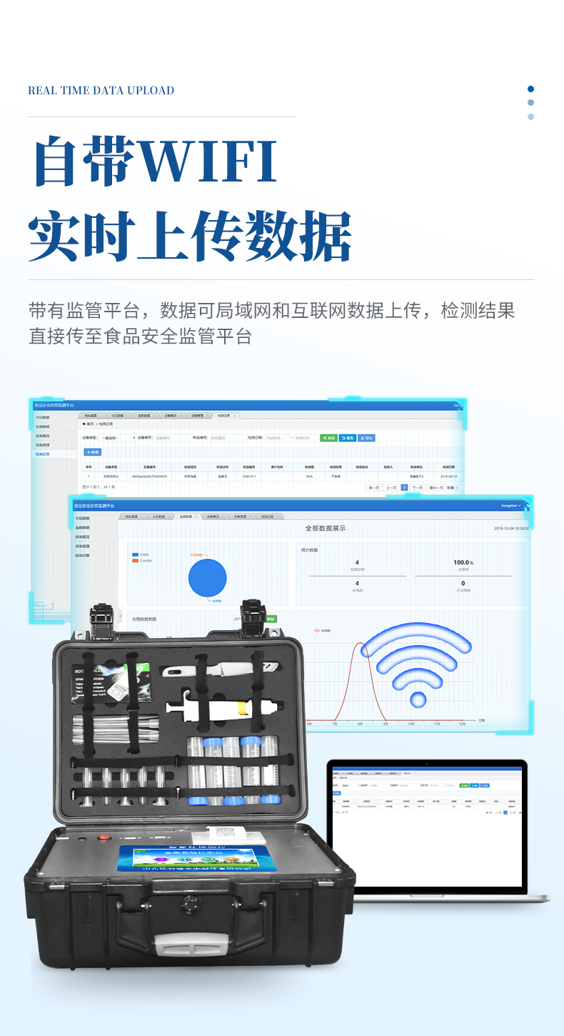 4、儀器帶有監(jiān)管平臺,數(shù)據(jù)可局域網(wǎng)和互聯(lián)網(wǎng)數(shù)據(jù)上傳,檢測結(jié)果直接傳至食品安全監(jiān)管平臺。進(jìn)行區(qū)域食品安全監(jiān)管及大數(shù)據(jù)分析處理與數(shù)據(jù)統(tǒng)計,檢測區(qū)域食品安全長短期動態(tài),達(dá)到食品安全問題預(yù)估、預(yù)警