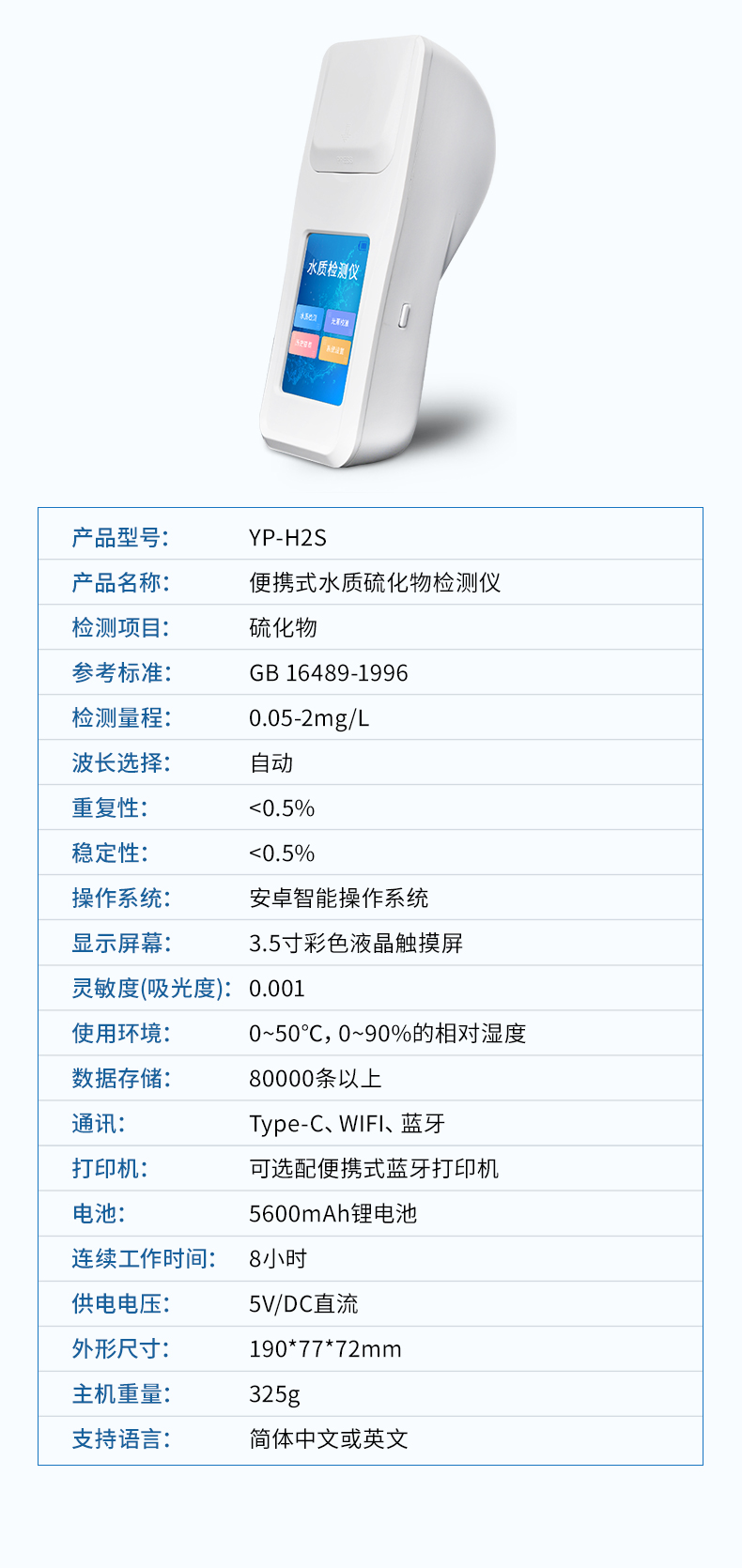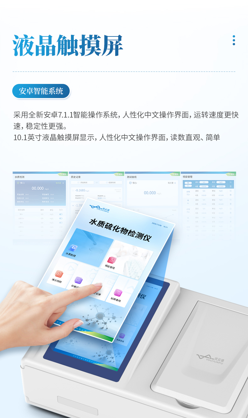 手持式硫化物檢測儀是參考《GB 16489-1996 水質(zhì) 硫化物的測定 亞甲基藍分光光度法》標(biāo)準(zhǔn)研發(fā)設(shè)計,可方便快速測定水體中硫化物濃度指標(biāo)。儀器配備高清晰度彩色液晶觸摸顯示屏,Android智能操作系統(tǒng),中文顯示界面,中英文鍵盤,人性化操作,使用更簡單;