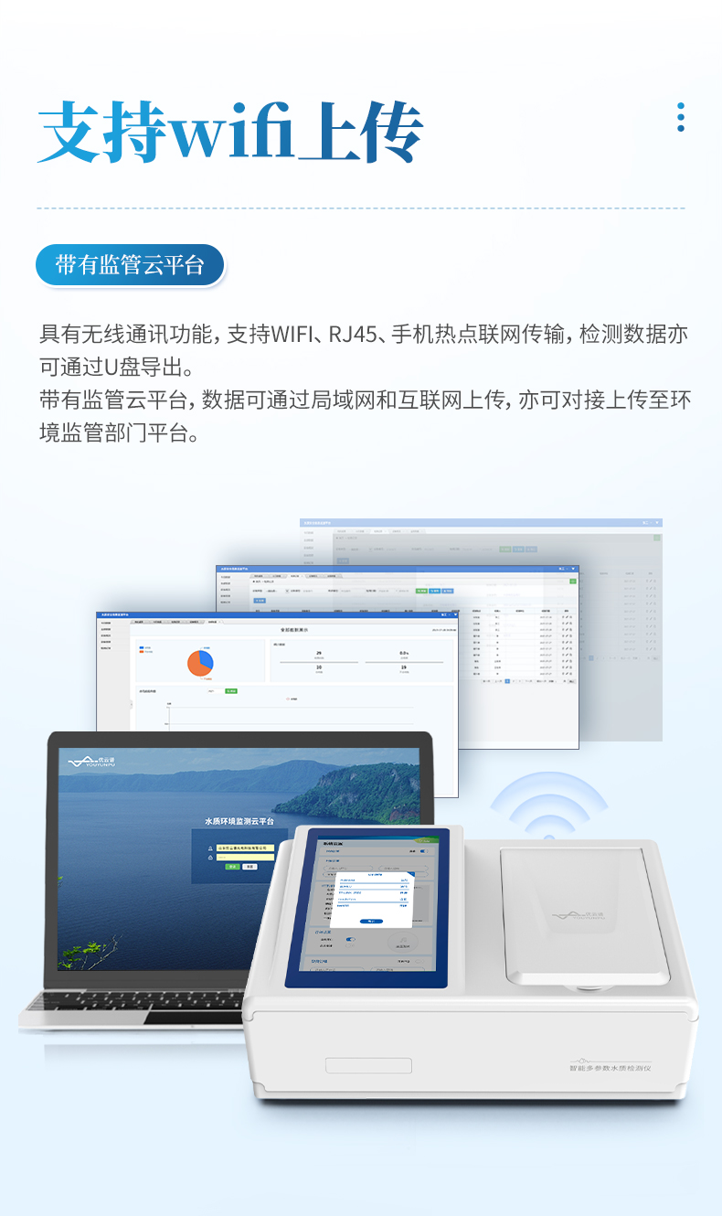 ②配置云監(jiān)控平臺,檢測結(jié)果可直接無線傳至平臺,進行水質(zhì)長短期分析,輔助管理。