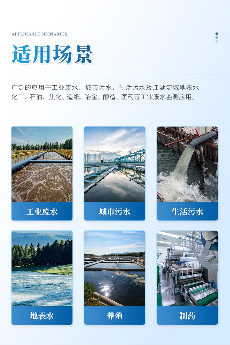 能夠廣泛的應(yīng)用于各種行業(yè)(工業(yè)廢水、城市污水、生活污水及江湖流域地表水)廢水的檢測,可適合不同用戶的多種需求,可在化工、石油、焦化、造紙、冶金、釀造、醫(yī)藥等工業(yè)廢水及各種生活污水監(jiān)測應(yīng)用。