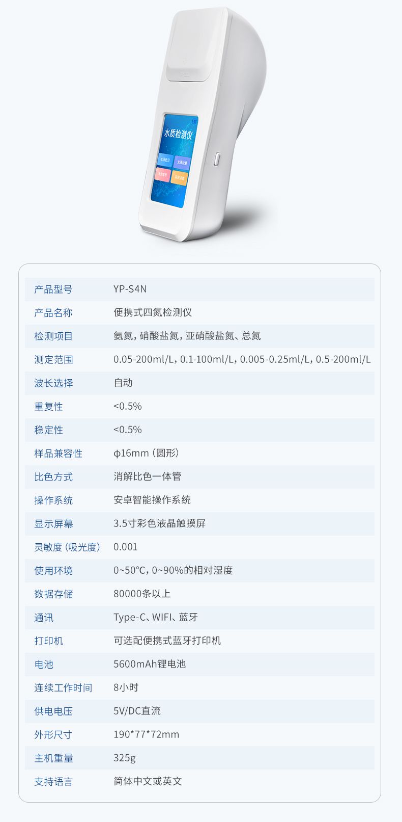 水質(zhì)四氮檢測儀是參考相關(guān)標(biāo)準(zhǔn)研發(fā)設(shè)計制造,本儀器主要檢測水質(zhì)氨氮、硝酸鹽氮、亞硝酸鹽氮、總氮濃度指標(biāo),兼具智能數(shù)據(jù)分析功能,圖表、列表顯示數(shù)據(jù),分析一目了然;高清晰度彩色液晶觸摸顯示屏,Android智能操作系統(tǒng),中文顯示界面,中英文鍵盤,人性化操作,使用更簡單。