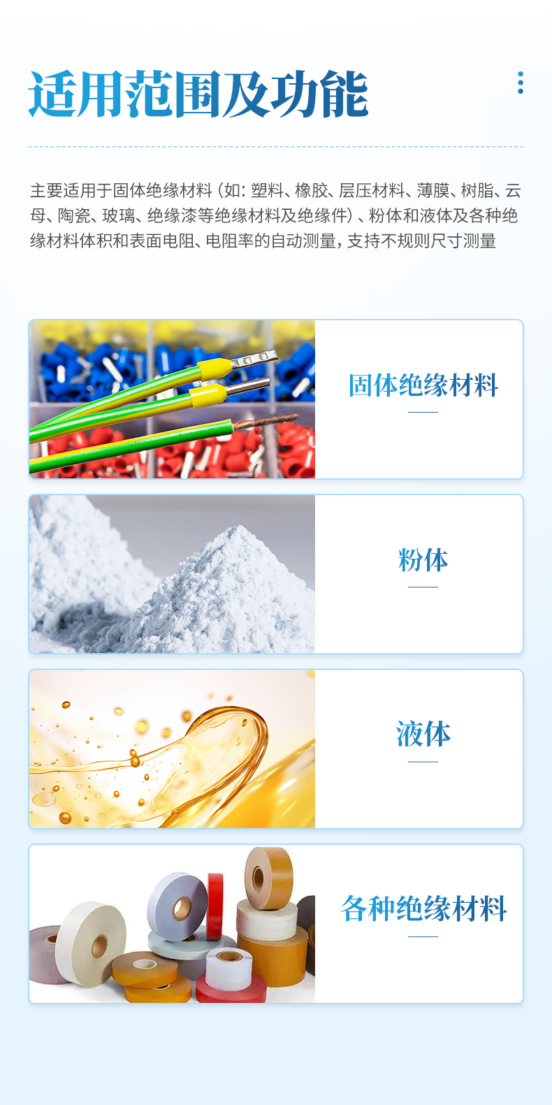 主要適用于固體絕緣材料(如:塑料、橡膠、層壓材料、薄膜、樹(shù)脂、云母、陶瓷、玻璃、絕緣漆等絕緣材料及絕緣件)、粉體和液體及各種絕緣材料體積和表面電阻、電阻率的測(cè)定。