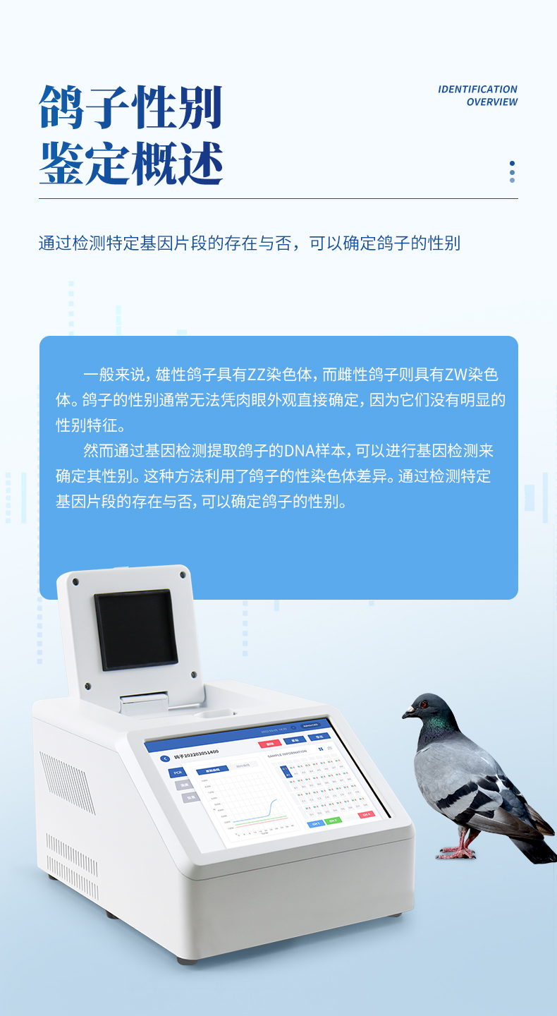 一般來(lái)說(shuō),雄性鴿子具有ZZ染色體,而雌性鴿子則具有ZW染色體。鴿子的性別通常無(wú)法憑肉眼外觀直接確定,因?yàn)樗鼈儧](méi)有明顯的性別特征。然而通過(guò)基因檢測(cè)提取鴿子的DNA樣本,可以進(jìn)行基因檢測(cè)來(lái)確定其性別。這種方法利用了鴿子的性染色體差異。通過(guò)檢測(cè)特定基因片段的存在與否,可以確定鴿子的性別。