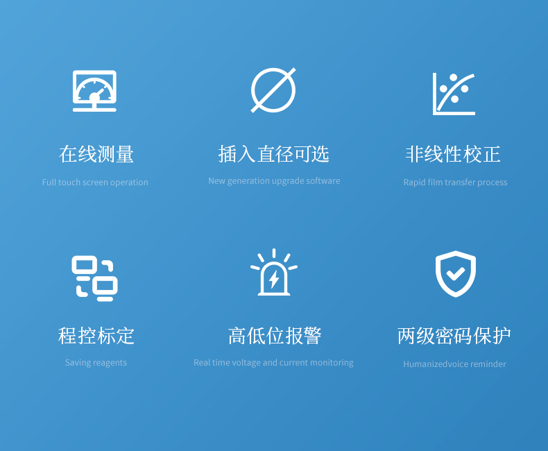 插入直徑可選,各種插入直徑的膜透器有多種插入長度可選。儀器具有非線性校正,程控標(biāo)定,高低位報(bào)警,兩級密碼保護(hù)重要數(shù)據(jù)和菜單組態(tài)等功能。