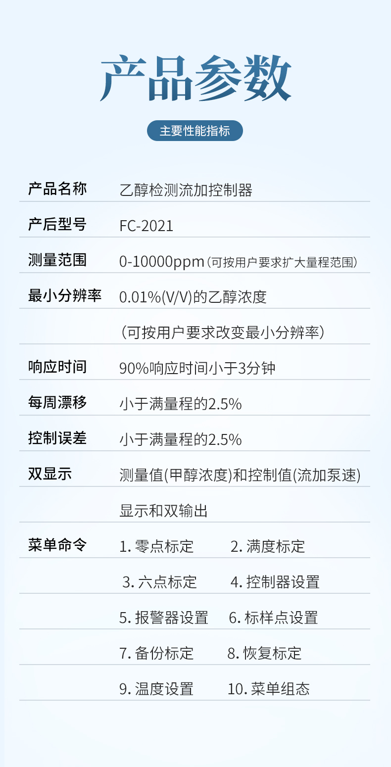 FC2021型乙醇檢測流加控制器是由單片微型計(jì)算機(jī)控制的智能化儀表。主要用于發(fā)酵過程中乙醇濃度的在線檢測和流加控制。