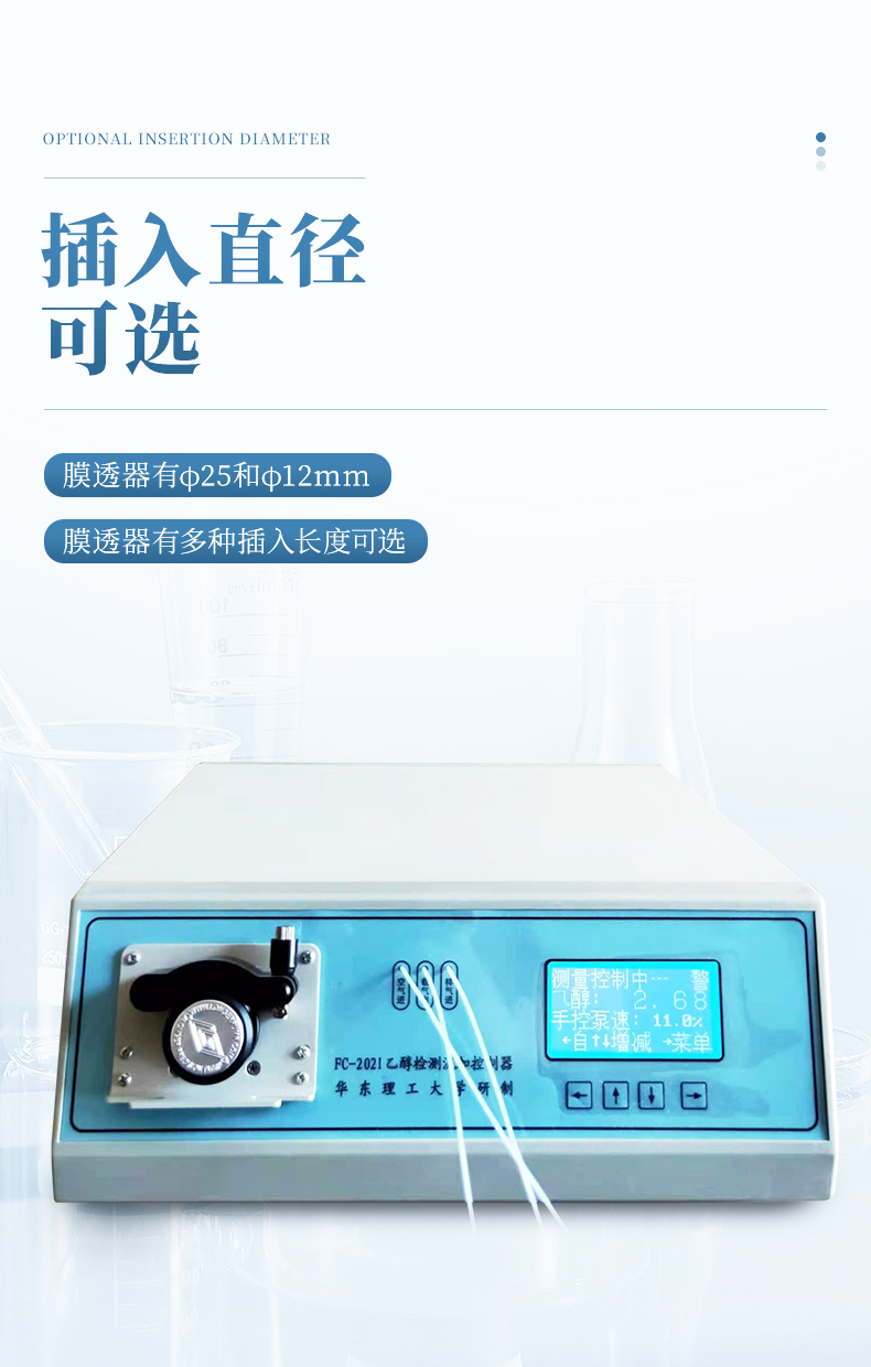在線測量發(fā)酵液中乙醇濃度,膜透器選用了不銹鋼絲網(wǎng)增強(qiáng)的高分子乙醇透過膜,可直接蒸汽滅菌。檢測傳感器工作在恒溫器中,克服了傳感器響應(yīng)的環(huán)境溫度影響。膜透器有φ25和φ12mm