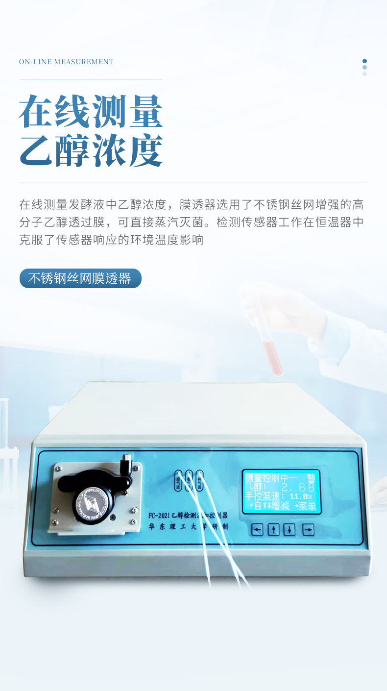 壓縮空氣(載氣)經(jīng)由膜透器流過時(shí),發(fā)酵液中的乙醇透過不銹鋼絲網(wǎng)增強(qiáng)的高分子膜,匯入到載氣流中,并被載氣帶至檢測傳感器轉(zhuǎn)換為電信號,檢測電信號經(jīng)電子線路放大,由機(jī)內(nèi)微型計(jì)算機(jī)計(jì)算測量結(jié)果,并進(jìn)行PID運(yùn)算,測量值和控制值送至顯示窗顯示,并在兩個(gè)模擬信號輸出口輸出4-20mA模擬信號,用于外接記錄儀記錄過程乙醇變化曲線和對料液流加蠕動(dòng)泵轉(zhuǎn)速進(jìn)行控制,達(dá)到發(fā)酵過程乙醇濃度在線檢測和控制目的。